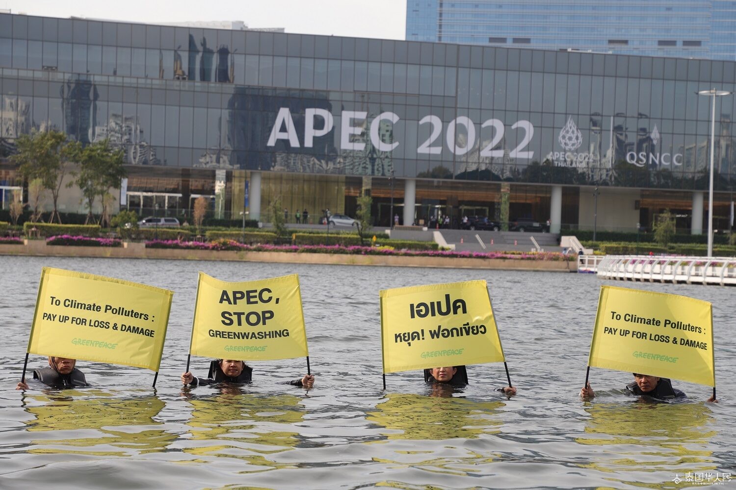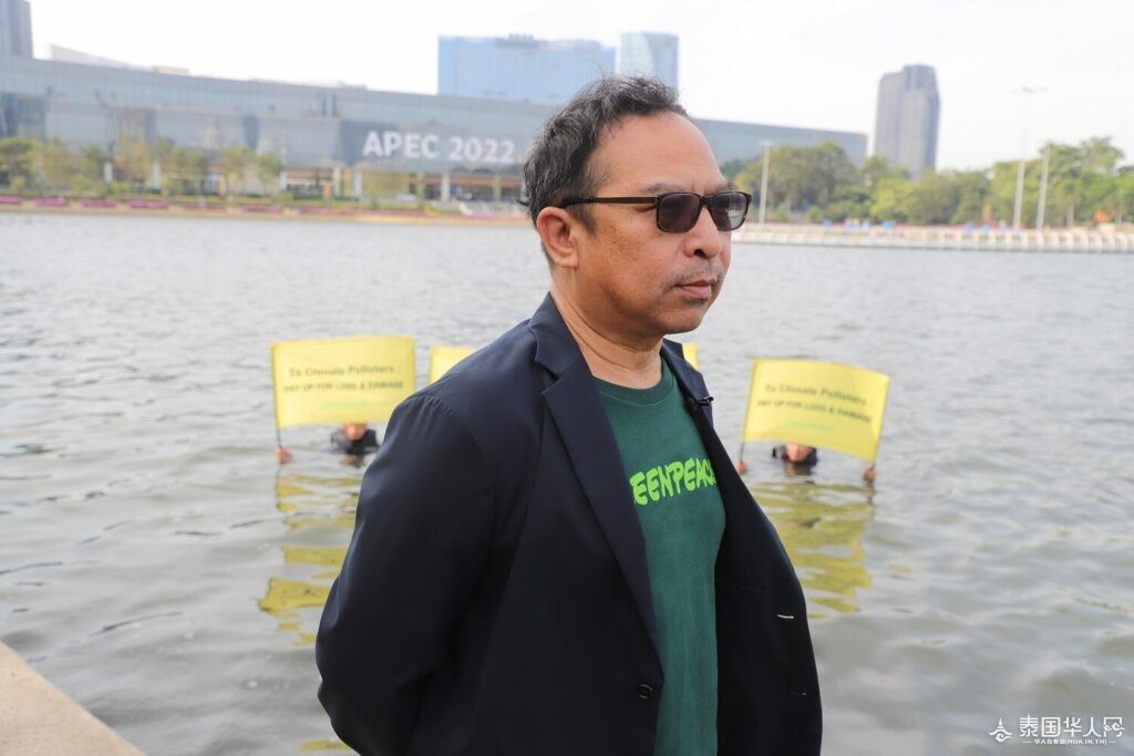泰国华人网讯 11月11日,APEC22会议召开在即,泰国“GreenPeace”组织成员跳入池塘,呼吁停止APEC,对发展中国家绿色发展不利的各项举措,设立损失恢复基金。此外,该组织成员还指出目前泰国的BCG可持续经济发展模式仍存在着严重的缺陷。 11月11日上午,按原计划,泰国副总理巴逸将在诗丽吉王后国家会议中心主持召开APEC2022交通安全小组委员会会议,泰国国家警察总署署长丹荣萨警上将及其他相关单位人员出席并观看APEC会议期间指挥系统测试演练。然而在巴逸抵达诗丽吉王后国家会议中心前1小时,泰国“GreenPeace”组织成员在会议中心附近的Benjakitti公园池塘组织了一场特色活动,部分组织成员跳入池塘,手拿标语牌,呼吁APEC停止,不利于绿色发展。 在《联合国气候变化框架公约》第27次缔约方大会期间,泰国“GreenPeace”组织曾呼吁政府联手推动设立损失基金,提出BCG可持续经济发展模式。但此次会议中所提出的措施仍存在缺陷,没有提及化石燃料行业及气候污染者的归责问题。