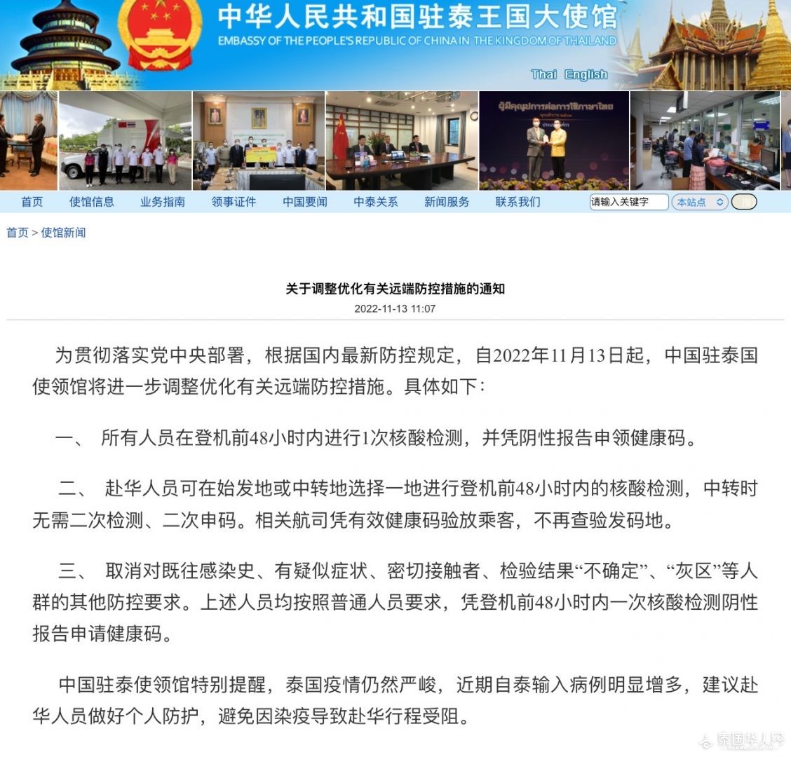 泰国华人网讯 中华人民共和国驻泰王国大使馆发布《关于调整优化有关远端防控措施的通知》,详情如下: 为贯彻落实党中央部署,根据国内最新防控规定,自2022年11月13日起,中国驻泰国使领馆将进一步调整优化有关远端防控措施。具体如下: 一、 所有人员在登机前48小时内进行1次核酸检测,并凭阴性报告申领健康码。 二、 赴华人员可在始发地或中转地选择一地进行登机前48小时内的核酸检测,中转时无需二次检测、二次申码。相关航司凭有效健康码验放乘客,不再查验发码地。 三、 取消对既往感染史、有疑似症状、密切接触者、检验结果“不确定”、“灰区”等人群的其他防控要求。上述人员均按照普通人员要求,凭登机前48小时内一次核酸检测阴性报告申请健康码。 中国驻泰使领馆特别提醒,泰国疫情仍然严峻,近期自泰输入病例明显增多,建议赴华人员做好个人防护,避免因染疫导致赴华行程受阻。 (来源:中国驻泰国大使馆官网) 原文:Thailand Headlines |