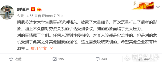 三言财经 4月20日消息,今日环球时报总编辑胡锡进对“明尼苏达女大学生民事起诉刘强东”发表评论,他认为对事件刘的形象会有沉重打击,“任何人遭到性侵指控,对其人设都是灾难性的”。 他认为“中国有些企业家的形象管理本身存有潜在危机,其中包括在舆论场的高调。企业家的人设一定要紧紧围绕其事业的核心内容进行打造,离开这个内容的任何延伸都要谨慎、再谨慎。”