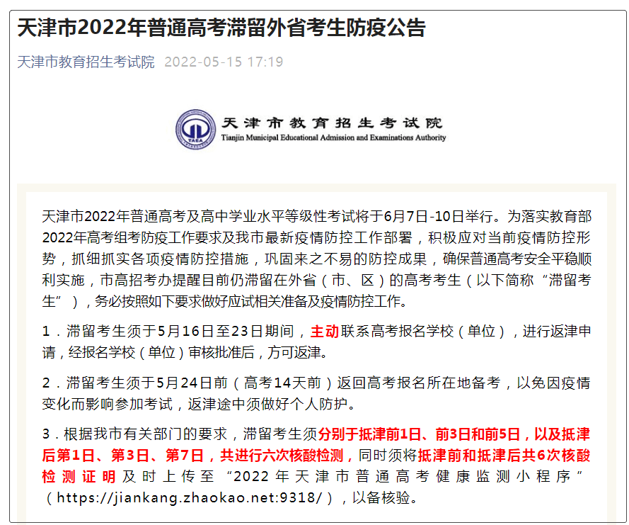 为落实教育部2022年高考组考防疫工作要求及我市最新疫情防控工作部署,积极应对当前疫情防控形势,抓细抓实各项疫情防控措施,巩固来之不易的防控成果,确保普通高考安全平稳顺利实施,市高招考办提醒目前仍滞留在外省(市、区)的高考考生(以下简称“滞留考生”),务必按照如下要求做好应试相关准备及疫情防控工作。 1.滞留考生须于5月16日至23日期间,主动联系高考报名学校(单位),进行返津申请,经报名学校(单位)审核批准后,方可返津。 2.滞留考生须于5月24日前(高考14天前)返回高考报名所在地备考,以免因疫情变化而影响参加考试,返津途中须做好个人防护。 3.根据我市有关部门的要求,滞留考生须分别于抵津前1日、前3日和前5日,以及抵津后第1日、第3日、第7日,共进行六次核酸检测,同时须将抵津前和抵津后共6次核酸检测证明及时上传至“2022年天津市普通高考健康监测小程序”,以备核验。 |