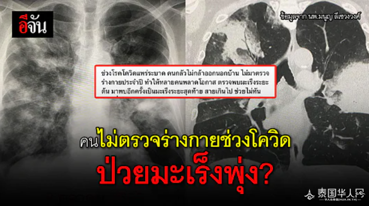泰国华人网讯 11月23日,据泰媒报道,Vichayut医院呼吸系统疾病专科医生Manoon博士在脸书上发布了关于疫情期间癌症逝者人数增加一则动态,动态详情如下: 新冠疫情期间,很多人不敢出门,没有参加年检,导致很多人错失了治疗癌症的良机。等到了去检查的时候才发现已经到了癌症晚期,无力回天了。目前全球都面临着因延误诊断病情,而导致癌症死亡人数增加的问题。