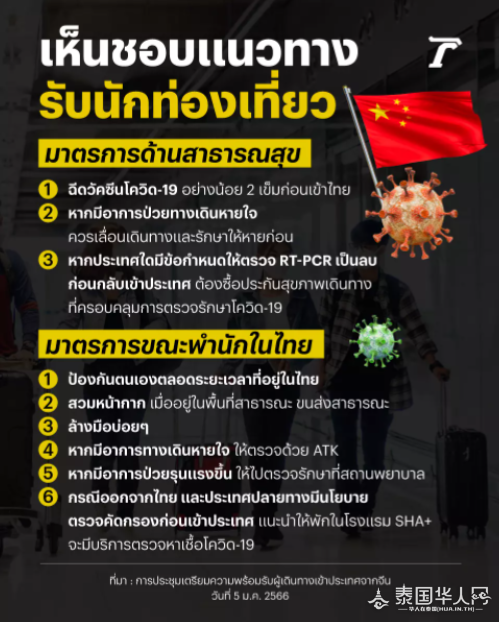 泰国华人网讯 ,针对迎接中国游客的计划,泰国公共卫生部、旅游与体育部、交通部、外交部和曼谷市召开会议讨论对策。会议上,“四部委一机构”一致同意,泰国采取“无区别-不增加-不删减”的原则,平等迎接所有国家的游客。会议上得出以下迎接游客的措施: