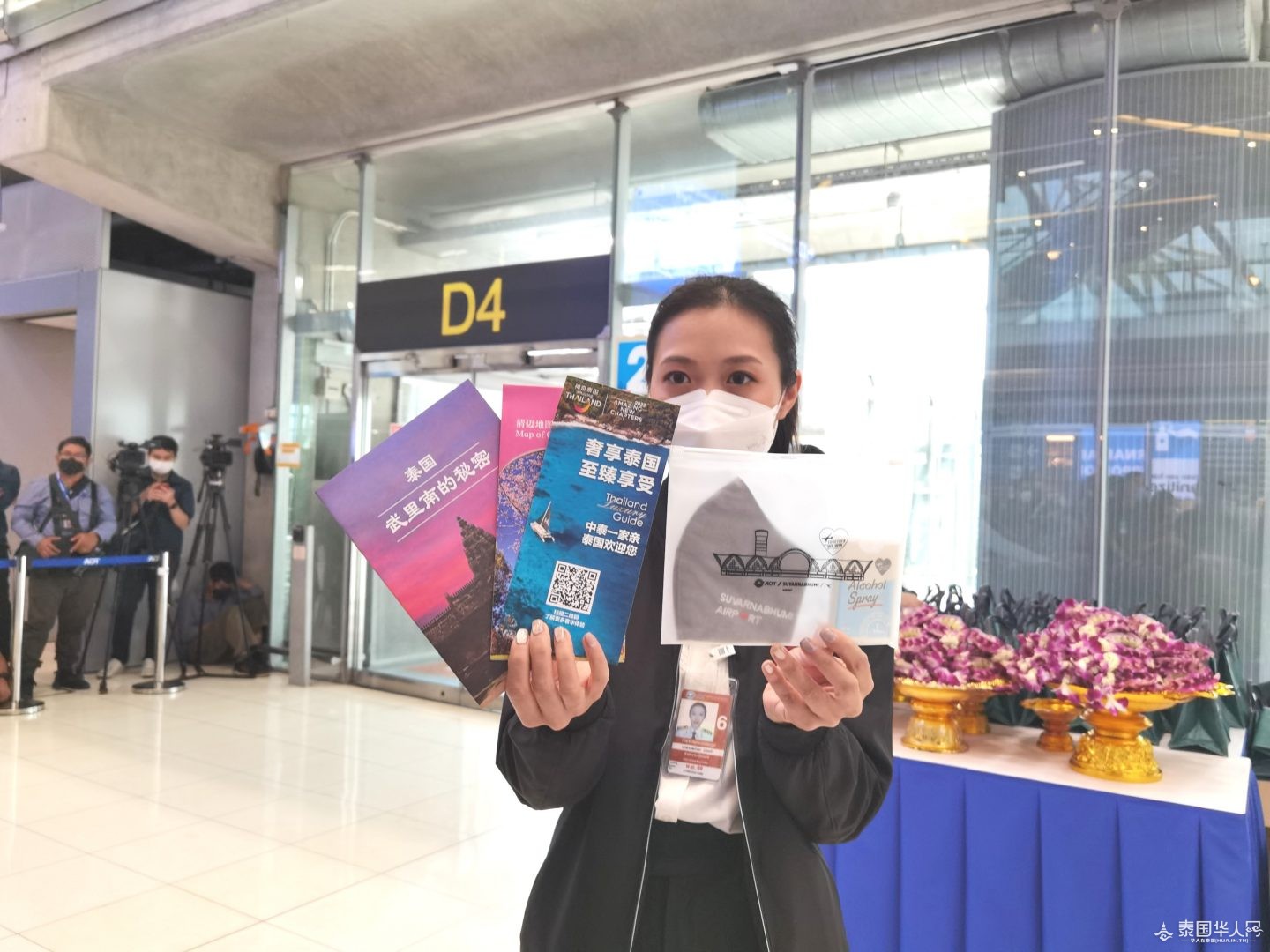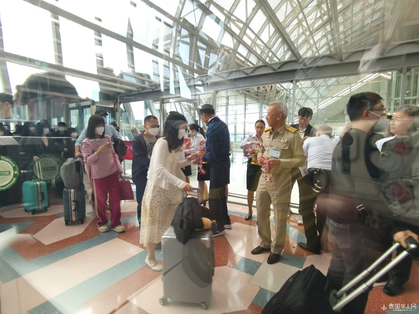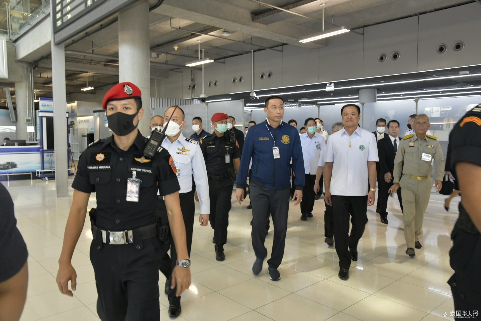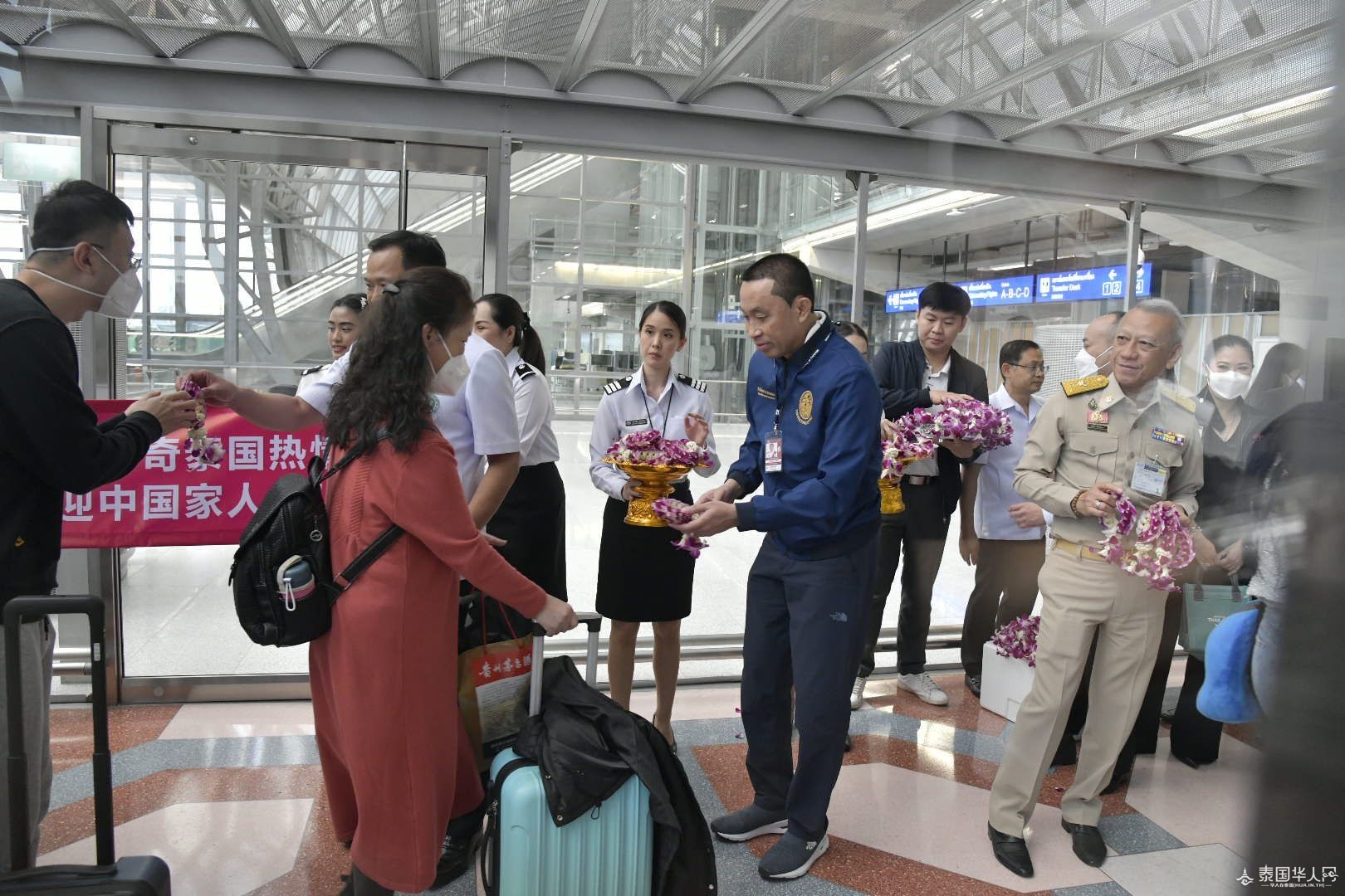 泰国华人网讯 1月9日,泰国副总理兼公共卫生部长阿努霆、旅游与体育部长皮帕、交通部长撒萨扬、泰国国家旅游局局长育塔萨、泰国公共机场有限公司领导等一行人在素万那普机场一同迎接中国放宽出入境管制后首批抵泰的中国旅客。该批中国旅客共269人,从厦门乘坐厦门航空MF833次航班于12时30分左右抵达泰国。阿努霆副总理等一行人为中国旅客送上兰花花环及口罩等伴手礼。