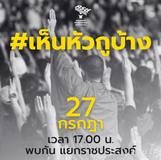 泰国华人网讯 7月26日,据泰国媒体报道,多个集会组织在社交媒体上发帖邀请民众于27日下午 5:00在四面佛附近参加游行。