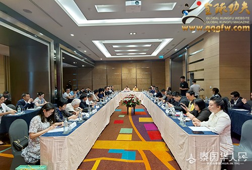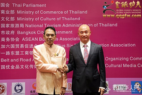 出席大会的领导与嘉宾有:泰国亲王刚猜阁下,泰国亲王善猜阁下,泰国陆军司令部上将安楠迪查阁下,联合国友好使者、泰中友好使者、中国民营经济国际合作商会主席、九届十届中国武协副主席、国际功夫联合会主席,北京少林武术学校总校长兼总教练、一球一村国际旅游房产公司总裁傅彪,中国阿拉伯国际合作中心主任高峰,江苏天工精密工具有限公司董事长朱小坤等百余位国际人士、中国企业家及华人华侨。