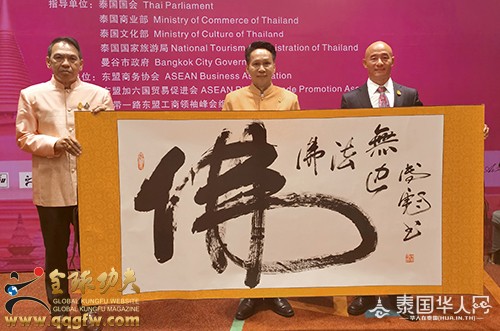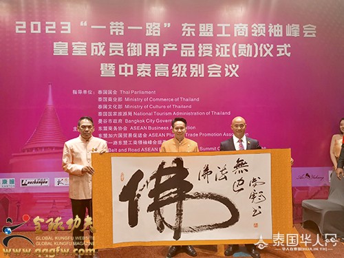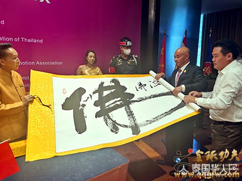 为表彰在中泰文化、经济领域杰出的企业家,刚猜亲王为傅彪佩戴“国王勋章”,善猜亲王为傅彪颁发“中泰交流领导者”荣誉证书,鼓励其为中泰文化的交流与发展所做出的突出贡献。傅彪现场赠送刚猜亲王、善猜亲王亲笔墨宝“佛”——寓意:善行天下,佛法无边。