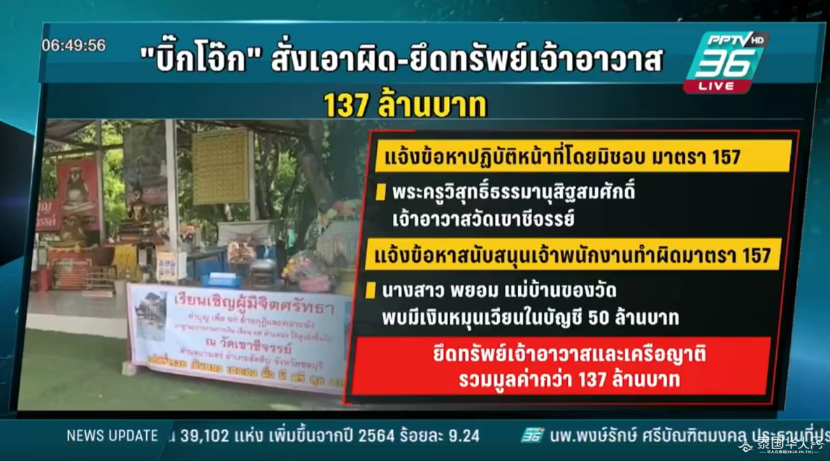 警方没收Khao Chi Charn寺庙住持及其亲属非法财产,总额逾1.37亿泰铢。警方还逮捕寺庙管家,并在其账户中发现非法流动租金,约5000万泰铢。