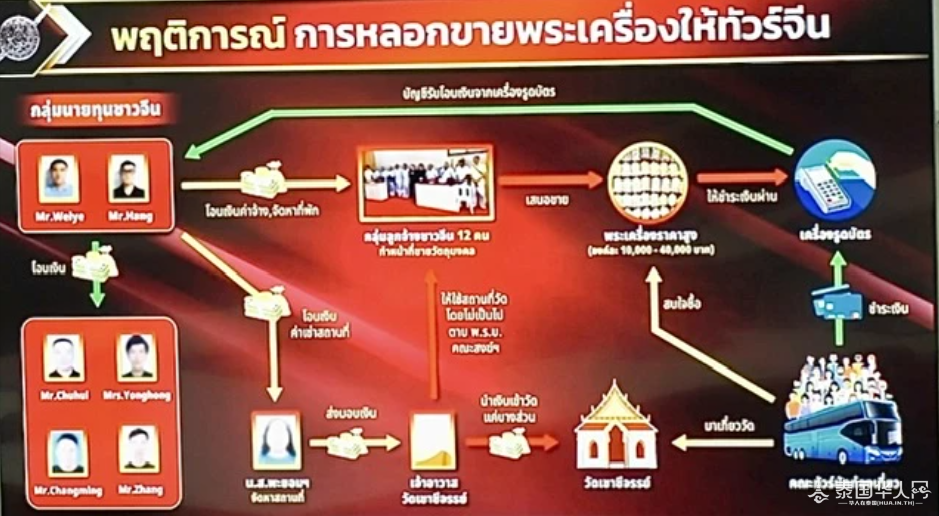据素拉切警上将透露,中国嫌疑人通过其泰籍妻子注册餐饮公司,每月以15万泰铢的租金租用寺庙场地,建造华丽楼房,但却用该场地来高价售卖护身佛饰等物品,将成本为400泰铢的佛饰以2万泰铢售出。