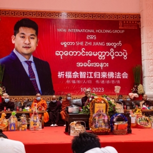亚太城主席何主席发言中说:先生是亚太的奠基人,也永远是亚太的领袖,这次祈福佛法会昭示了索其督将军对先生为水沟谷建设做出杰出贡献的敬意,显示了水沟谷人民对先生广布福德、造福一方的感恩深情;也彰显了水沟谷与亚太人同心相连、敬重感恩的高尚品德。先生曾说过“如果当地村民没有富起来,亚太集团就白来了,必须要让当地老百姓先富起来,把水沟谷亚太城建设成为缅甸最现代化的城市。”亚太人必将秉承先生的理念,不忘初心、砥砺前行,致力于将水沟谷建设成为我们美好的第二故乡!让我们共同为先生祈祷,愿他早日平安归来,带领我们建设一个更加幸福、美好的水沟谷亚太城。