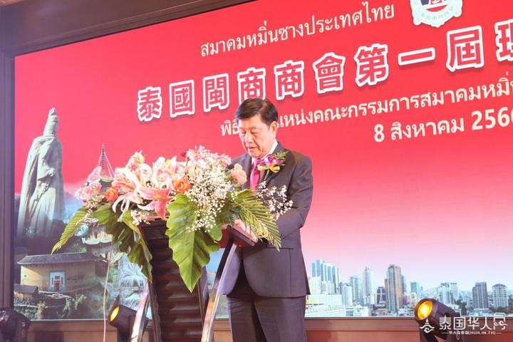 泰国前国会主席、泰中经济文化协会会长颇钦·蓬拉军博士表示,很高兴各商会人员能欢聚一堂,希望大家能携手共建一个和谐的营商环境,合乎当地的法律法规长久经营,愿泰国闽商商会能越来越好。
