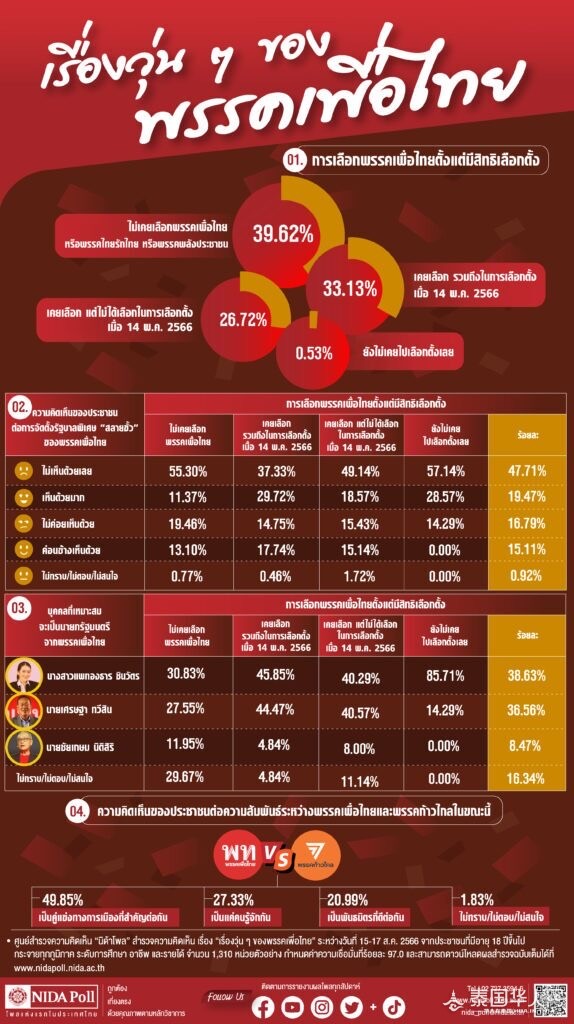 据调查,当被问及是否给为泰党投过选票时,39.62% 的受访者表示其从未给为泰党投过选票;33.13% 的受访者表示其曾在5月14日大选中给为泰党投过选票;26.72% 的受访者表示其未在5月14日大选中给为泰党投票;0.53% 的受访者表示其没有参与大选投票。 当被问及为泰党此次组阁是否能有效解决“政局两极分化”问题时,47.71% 的受访者表示完全不赞同;19.47%的受访者表示完全赞同;16.79%的受访者表示不太赞同;15.11%的受访者表示比较赞同;0.92% 的受访者表示不知道/不回答/不感兴趣 当问及为泰党总理候选人当中谁是总理的合适人选时,38.63%的受访者认为应当是贝东丹;36.56%的受访者认为是瑟塔;8.47%的受访者认为是差戛瑟;16.34% 的受访者表示不知道/不回答/感兴趣。 最后,当问及此时如何看待为泰党与前进党的关系时,49.85%的受访者表示两党是重要的政治对手;27.33%的受访者表示两党只是彼此认识;20.99%的受访者表示两党关系不会受此次事情的影响;1.83%的受访者表示不知道/不回答/不感兴趣。