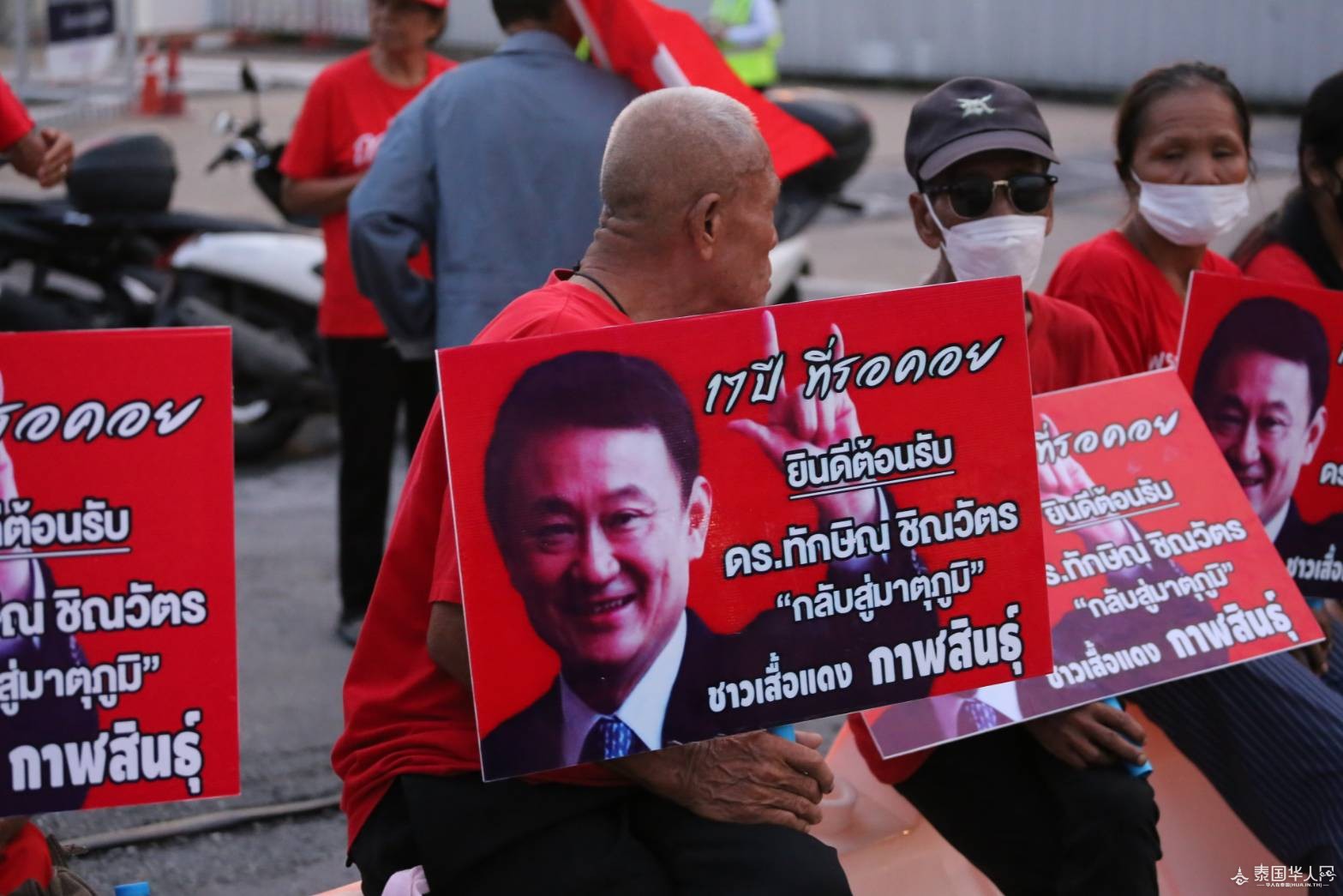 他信将于9点抵达廊曼机场。今日一大早就有大量为泰党或前泰爱泰党的支持者“红衫军”在机场等候,迎接他信回国。