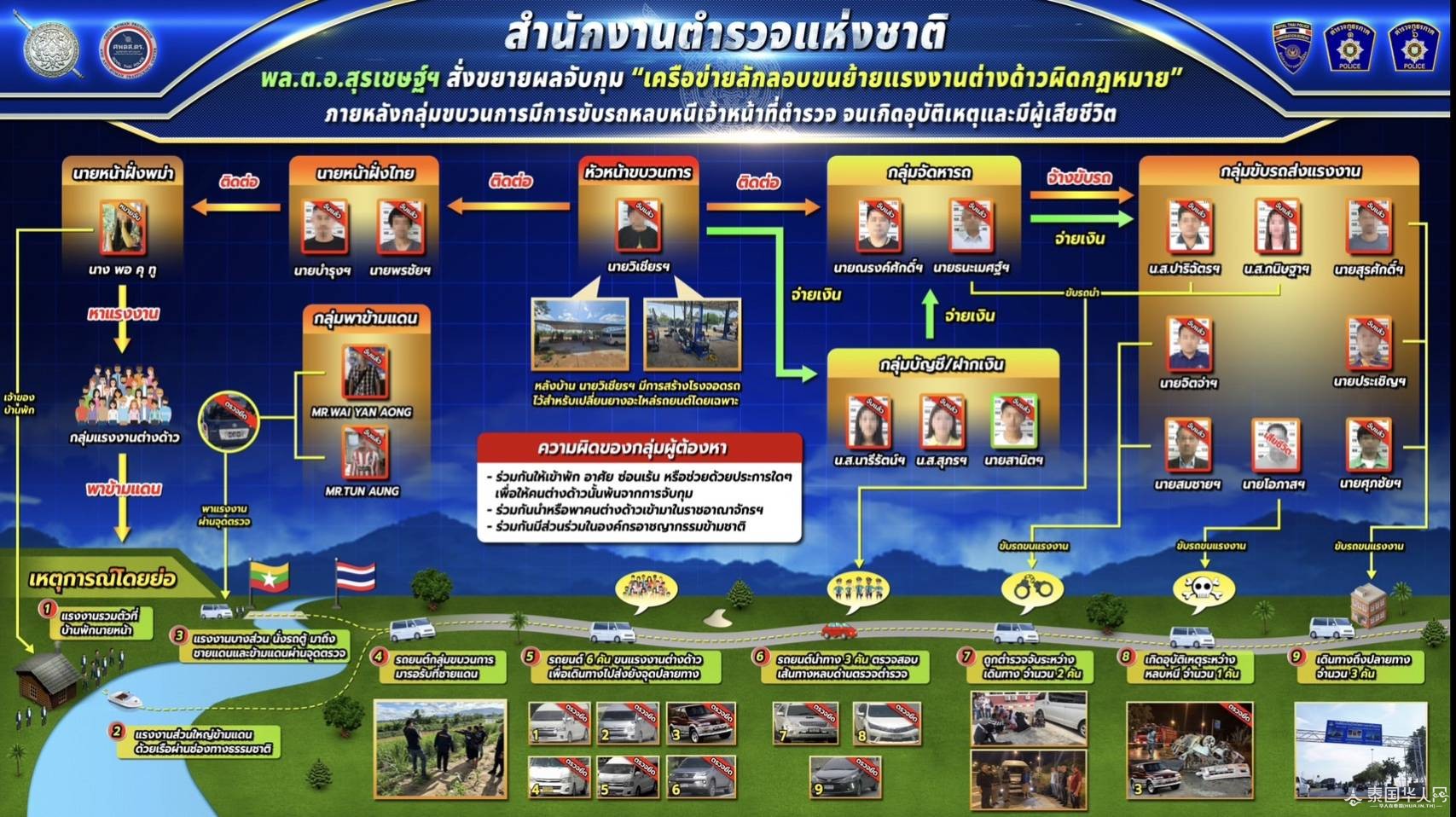 经调查发现,涉及的三个警局所抓获的犯罪嫌疑人均来自同一个犯罪团伙。犯罪团伙的行动方式显然分工明确,他们组织了秘密车队将这些非法外劳偷运入境。此外,犯罪分子还将人和车辆安排在指定地点,以便在确定没有检查站或官员之后,将非法劳工送至目的地。警方根据这些线索在那空沙旺府直辖县警察局成功逮捕了2名货车司机、1名领头司机以及26名非法劳工。同时,警方也发布了通缉令,追捕其他逃脱的犯罪分子。