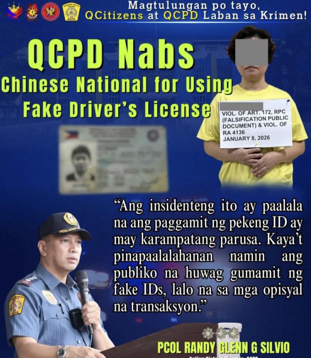 据悉,该女子为中国公民,长期居住于马卡蒂市,目前已被移送至检察官办公室,将因涉嫌违反《修订刑法》第172条及《陆路交通与运输法》面临指控。警方提醒公众,任何涉及官方事务的场合切勿使用伪造证件,以免触犯法律并承担严重后果。 |