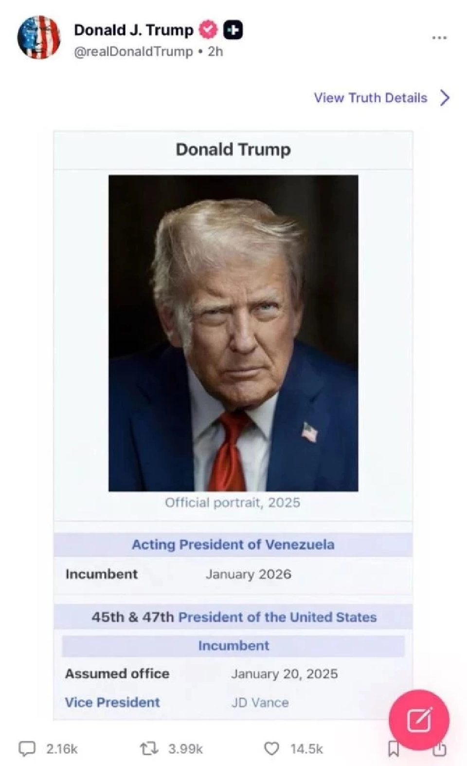 2026年1月3日,美国军方在加拉加斯拘捕委内瑞拉前总统尼古拉斯·马杜罗后,该国政坛出现权力真空。特朗普借此通过Truth Social平台宣布,从2026年1月起,他同时担任美国总统与“委内瑞拉代理总统”,声称对委内瑞拉拥有绝对权威。 特朗普强调,委内瑞拉不再需要依赖外力保护,因为它已由世界上最强大的军队——美国军队——保护。他警告古巴政府,若不尽快与美国达成协议,将为时已晚,并宣布每天约3.5万桶石油运输将停止,同时停止委内瑞拉原先向古巴提供的巨额资金。特朗普还表示支持美国国务卿马可·卢比奥担任古巴总统,称古巴正处于“崩溃边缘”,在当前情况下可能无需采取军事干预。