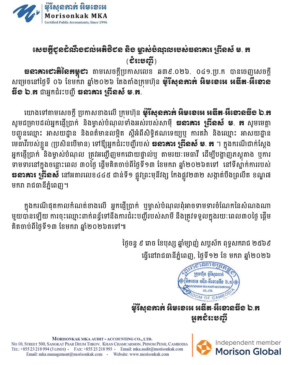 泰国华人网讯 柬埔寨太子银行(Prince Bank, M.A.)的官方清算人 Morrison Kak MKA Audit-Accounting, LLC 于 2026 年 1 月 13 日正式发布公告,通知所有储户和债权人,在公告发布之日起 30 天内提供相关信息和证据,以申请银行赔偿。 公告指出,所有太子银行储户和债权人需将姓名、地址、索赔或异议详情,以及律师信息(如有)提交至清算人。提交地点为金边市第七玛卡拉区(7 Makara)万普拉利分区(Boeung Prlit)232 街拐角处 Preah Monivong 街 445 号楼 1 楼的太子银行总部。 公告特别强调,储户或债权人必须在 30 天内亲自或委托律师提交索赔或证据,逾期将无法获得任何赔偿。与此同时,太子银行的借款人仍需按照合同约定继续履行还款义务,相关债务不会因清算程序而中止。 此次公告旨在确保太子银行清算程序透明化,并提醒所有储户及时提交资料,以便获得合法赔偿。清算人将依照提供的证据核实索赔,并根据法律程序处理赔偿事宜。 公告发布后,太子银行储户和债权人纷纷关注,确保自身权益不受影响,同时也提醒在泰国、菲律宾等地从事金融和博彩业务的华人群体关注相关跨境金融风险 |