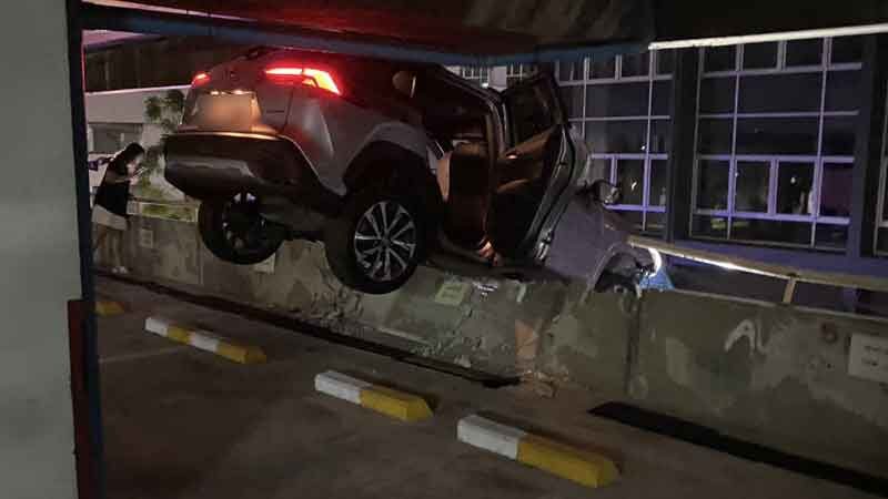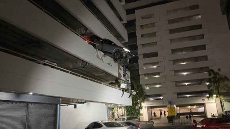 据当地媒体报道,事故发生地点位于曼谷孔提区拉玛四路一带。事发建筑为一座高7层的停车楼,事故发生在停车楼第2层,一辆灰色丰田轿车,悬挂曼谷牌照,撞穿水泥墙体后停在停车楼外侧边缘,随时有坠落风险,引发周边民众高度恐慌。