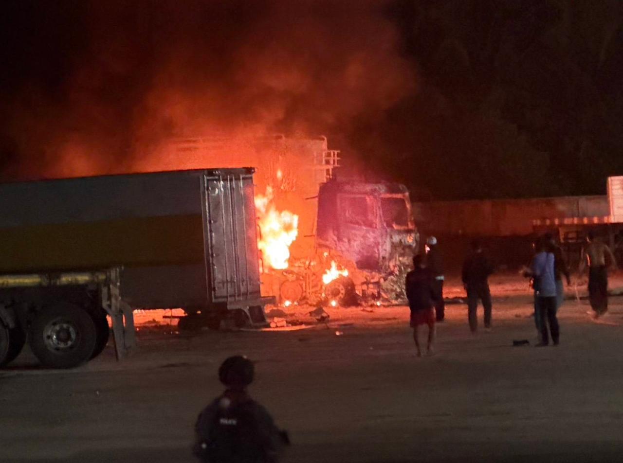 | 泰国华人网讯 泰国南部那拉提瓦府发生疑似报复性爆炸纵火事件,两辆卡车在走私燃油仓库附近被引燃焚毁。