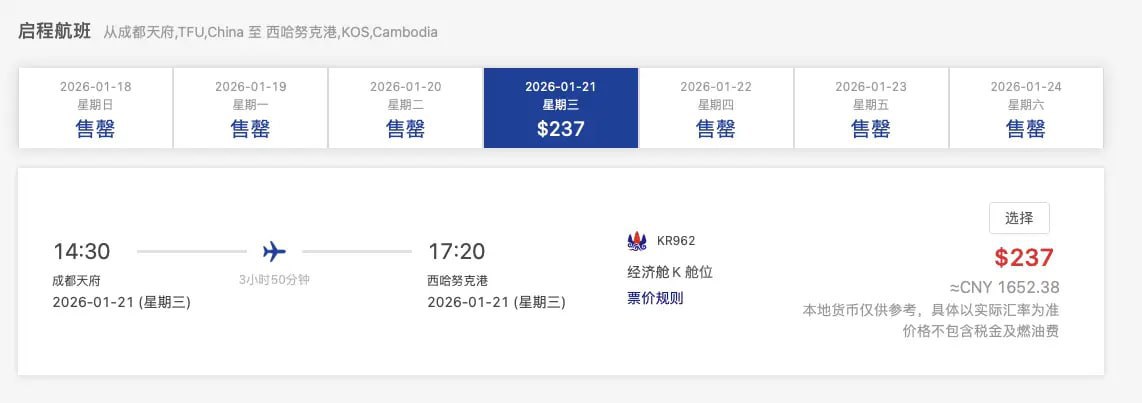 | 泰国华人网讯 自2026年1月21日起,柬埔寨航空正式开通成都直飞西哈努克港(西港)的航线。这是继成都直飞金边航线之后,成都开通的第二条往返柬埔寨的直飞航线,为两地旅客提供了更加便捷的出行选择。 成都往返西港航线每周三、五、七执飞。成都出港航班编号为KR962,计划于14:30从成都天府国际机场起飞,当地时间17:20抵达西哈努克国际机场。航班单程空中飞行时间约为3.5小时。 回程航班编号为KR961,计划当地时间09:00从西哈努克国际机场起飞,13:30抵达成都天府国际机场。航线开通后,将进一步便利成都与西港之间的商务、旅游及人员往来,同时丰富中柬直飞航班选择。