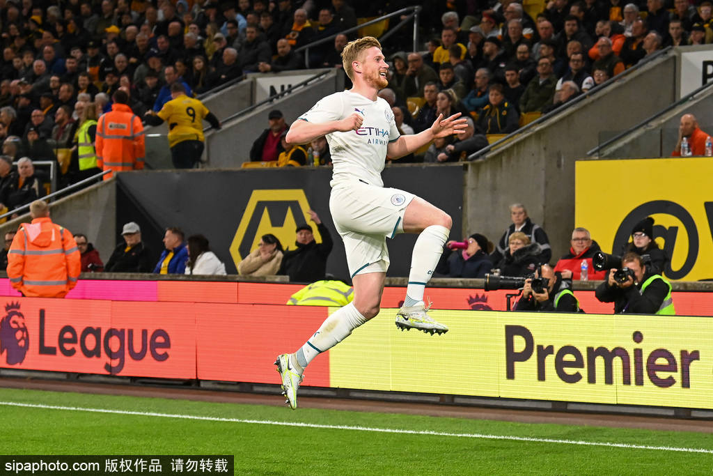 北京时间5月12日凌晨3点15分,2021-2022赛季英超第33轮展开一场焦点战役,狼队坐镇主场对阵曼城。上半场完全是德布劳内的个人秀,丁丁先是插上射远角为曼城首开纪录,尽管狼队由登东克尔在反击中扳平比分,不过德布劳内立马给予了还击,比利时人先是在门前跟进补射得手,随后禁区外围轰出贴地斩在23分钟上演帽子戏法。下半场斯特林攻入一球因越位在先进球无效,随后德布劳内完成大四喜,斯特林门前推空门得手,福登和丁丁相继射门击中立柱弹出。全场比赛结束,曼城客场5-1大胜狼队,继续以3分的优势领跑。 第6分钟,B席直塞,德布劳内高速插上射远角破门,曼城1-0。