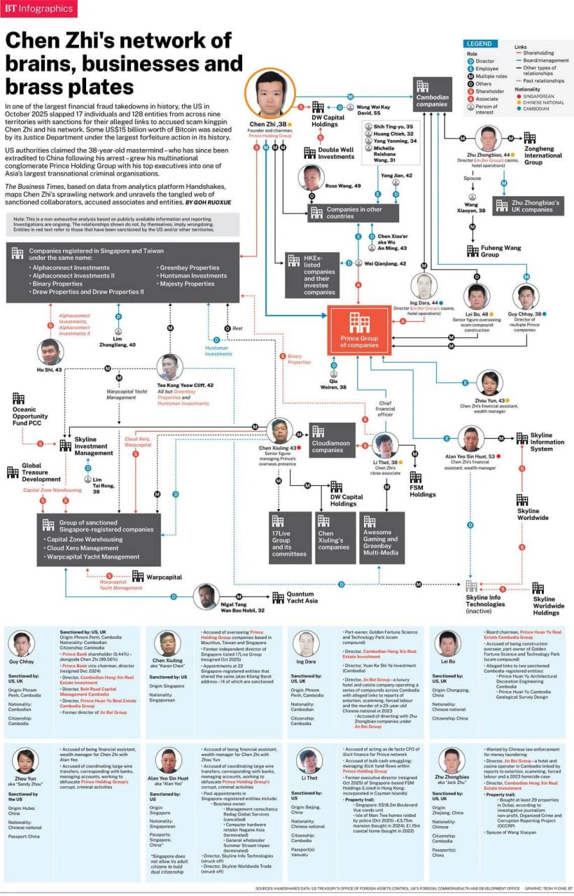 | 泰国华人网讯 2026年1月23日,新加坡财经媒体《商业时报》借助企业与人物关系分析平台 Handshakes 的数据,首次以“网络结构”的方式,系统拆解了围绕陈志(Chen Zhi)形成的跨国诈骗版图。报道指出,这不仅是个案犯罪,更揭示了一种高度组织化、公司化、资本化的现代诈骗模式。 首先,与传统印象中的地下黑帮不同,Handshakes 数据显示,陈志网络呈现出明显的企业集团特征:大量注册于不同司法辖区的公司、交叉持股、董事与股东重复出现、表面合法的业务领域涵盖地产、酒店、博彩、科技、支付等,且拥有清晰的层级结构与角色分工。这些实体并非随机存在,而是构成一个彼此相互掩护的商业网络。当其中一家公司被调查或制裁时,资金和业务可以迅速转移至关联实体,形成“切割式防火墙”。 其次,柬埔寨并非整个网络的全部,而是一个关键的运营和执行中心。Handshakes 的关系图谱显示,关键控股、融资及指挥节点分散在多个国家和地区,而实际决策层通常隐藏在远离诈骗现场的司法和金融体系中。这意味着,单纯打击某一国家或园区,难以真正瓦解整个诈骗体系。