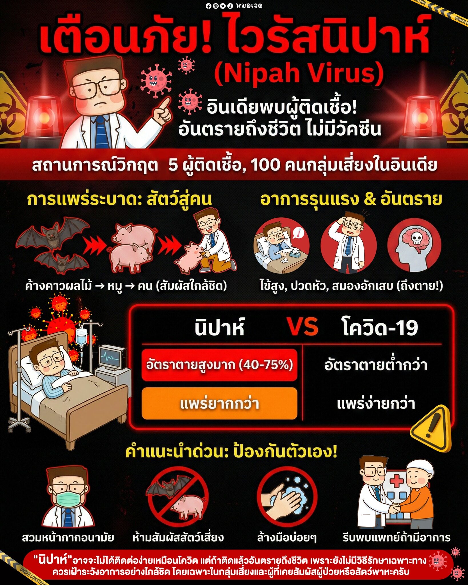 | 泰国华人网讯 近日,随着“尼帕病毒”频繁出现在国际新闻中,公众对该病毒的关注持续升温。泰国玛哈拉差那空叻差是玛医院副院长、负责初级医疗事务的杰医生通过个人社交平台发布信息,系统梳理了关于尼帕病毒的5个关键事实,提醒社会大众不要低估这一高致死率病毒的真实威胁。 杰医生指出,尼帕病毒被列为高危新发传染病,并非只存在于遥远地区。该病毒不仅可由动物传染给人,也已确认具备人传人的能力,且对人体的破坏并不限于呼吸系统,而是可直接侵害大脑与中枢神经系统,危险性远高于普通传染病。