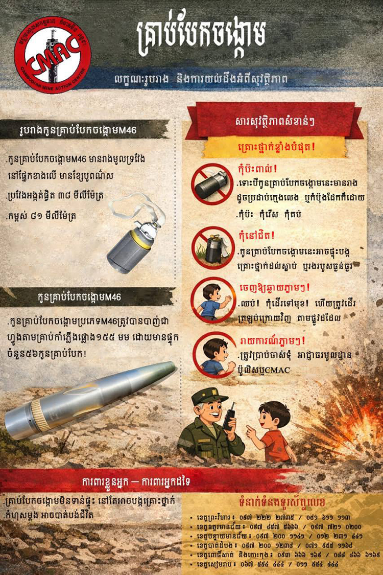 | 泰国华人网讯 柬埔寨地雷行动中心(CMAC)今日发布紧急警告,呼吁居住在柬泰边境省份的居民,对泰军在柬埔寨境内使用的M46集束炸弹子母弹保持极度警惕。 CMAC通过官方社交媒体公告指出,这些子母弹对平民构成严重威胁,尤其是许多子母弹已经在居民区及周边地区被发现。公告附有M46子母弹图片,并提醒民众:“这是泰军在柬埔寨使用的M46集束炸弹子母弹的外观。大多数子母弹已在居民区发现。公众务必高度警觉,并告知家人,尤其是居住在高风险区域的人员,切勿触碰子母弹,并应立即向CMAC报告。”