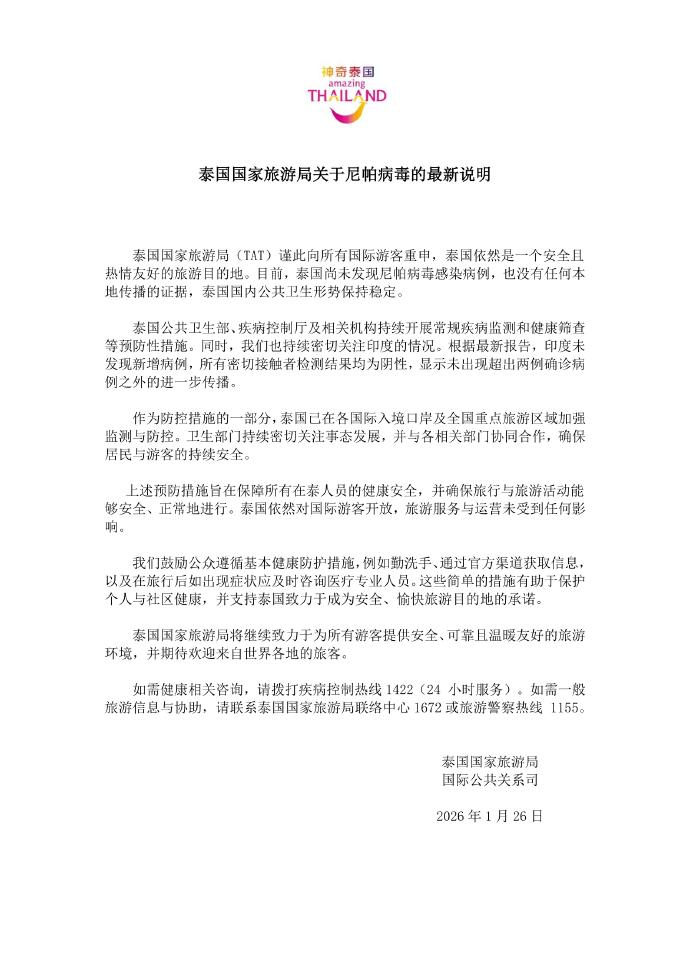 | 泰国华人网讯 2026年1月28日,泰国国家旅游局(TAT)向国际游客重申,泰国依然是安全且热情友好的旅游目的地。目前,国内尚未发现尼帕病毒感染病例,也没有任何本地传播的证据,公共卫生形势保持稳定。 泰国公共卫生部、疾病控制厅及相关机构持续开展常规疾病监测和健康筛查等预防措施,同时密切关注印度疫情动态。根据最新报告,印度未发现新增病例,所有密切接触者检测结果均为阴性,显示未出现超出两例确诊病例之外的进一步传播。