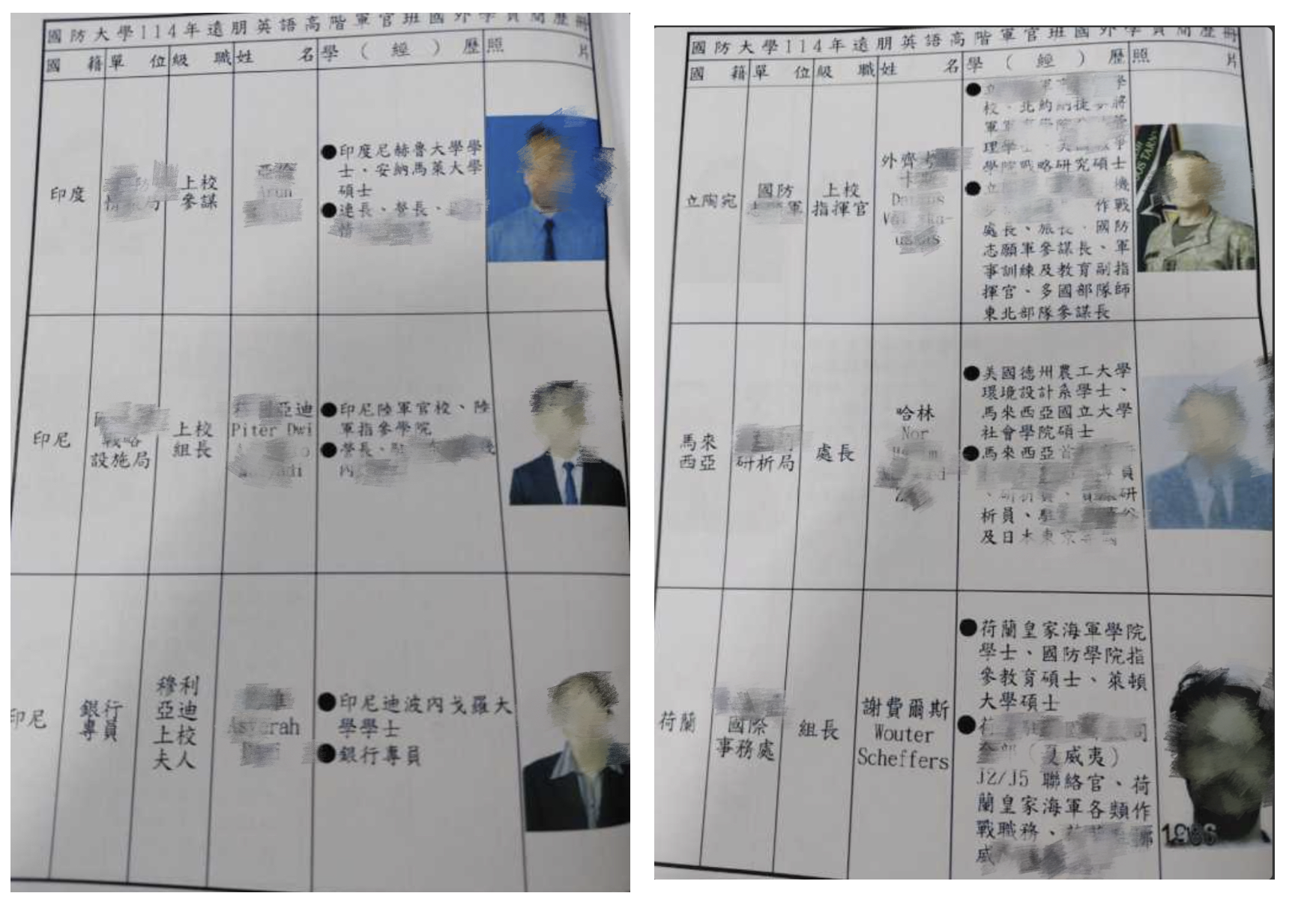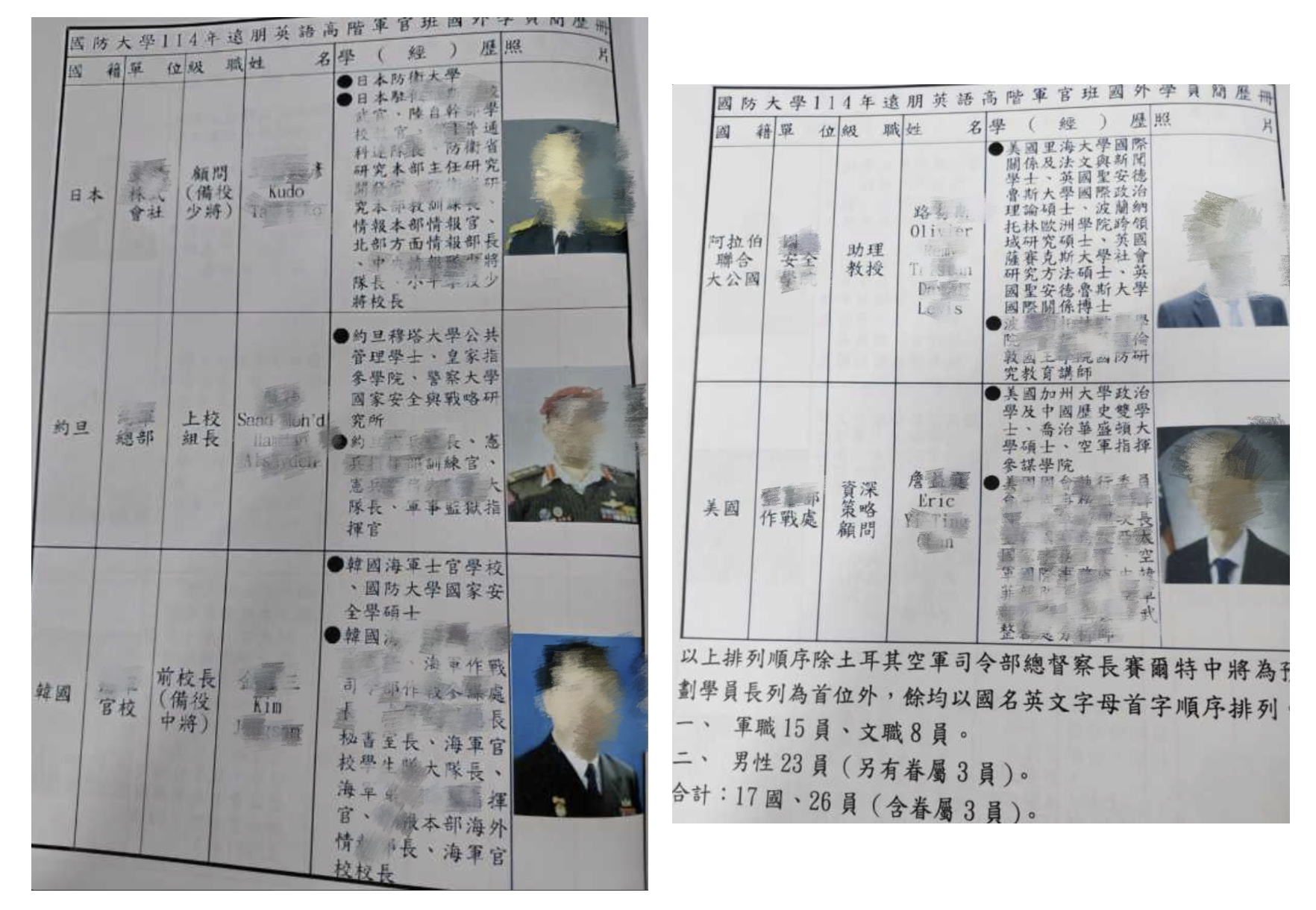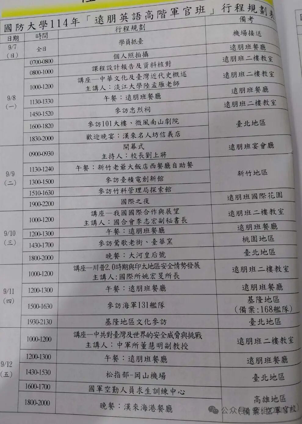 | 泰国华人网讯 2026年1月27日,据台湾地区多家媒体报道,中国台湾地区一项军事培训项目部分内部资料在网络上扩散,涉及“远朋英语高阶军官班”的文件,披露内容包括来自17个国家的学员名单及课程安排,引发外界对台湾地区信息管理与保密机制的关注。 泄露文件显示,参加此次“远朋班”的26名学员来自美国、德国、日本、泰国、马来西亚、韩国等17个国家,部分人员背景涉及北约体系、情报部门及国防研究机构,包括美国空军顾问、德国前北约教务负责人、日本退役将领等。课程内容涵盖“区域安全与地缘政治议题”“台湾地区发展情况”,并安排参访台湾地区部分军事设施及与官员会面。 公开资料显示,“远朋班”项目可追溯至1971年冷战时期,早期称“远朋国建班”,定位为对外交流培训项目,主要面向亚非拉国家官员。近年来,该项目逐步涉及安全与防务议题,通过讲座研讨、部队参访和政经考察等形式运作,兼具对外交流与政策沟通功能。