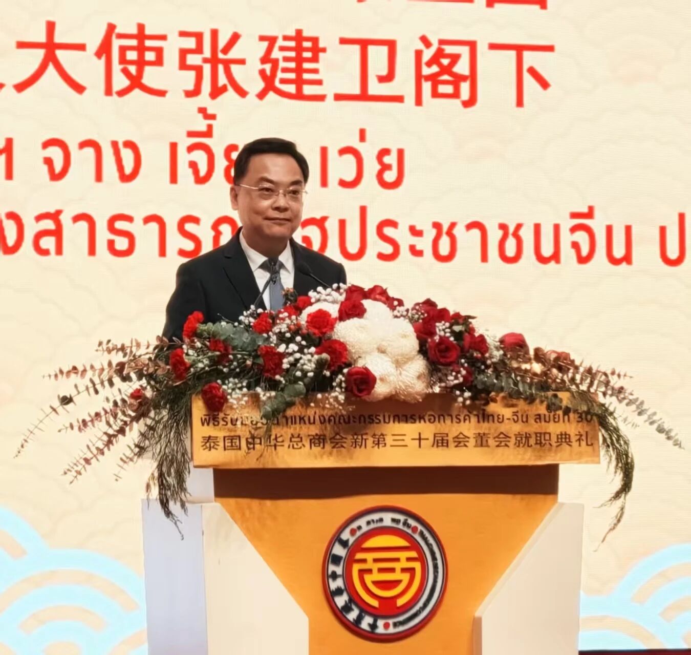 | 泰国华人网讯 2026年1月28日,驻泰国大使张建卫应邀出席泰国中华总商会第三十届会董会就职典礼,并对林楚钦先生连任中华总商会主席表示热烈祝贺,同时庆祝新一届会董会正式就职。张大使高度肯定中华总商会在促进中泰经贸合作及服务泰国华侨华人社区方面的重要贡献,并希望新一届会董会继续发扬优良传统,带领泰华社会蓬勃发展,为中泰民众谋福祉,为中泰命运共同体建设作出贡献,为中泰友谊增添光彩。