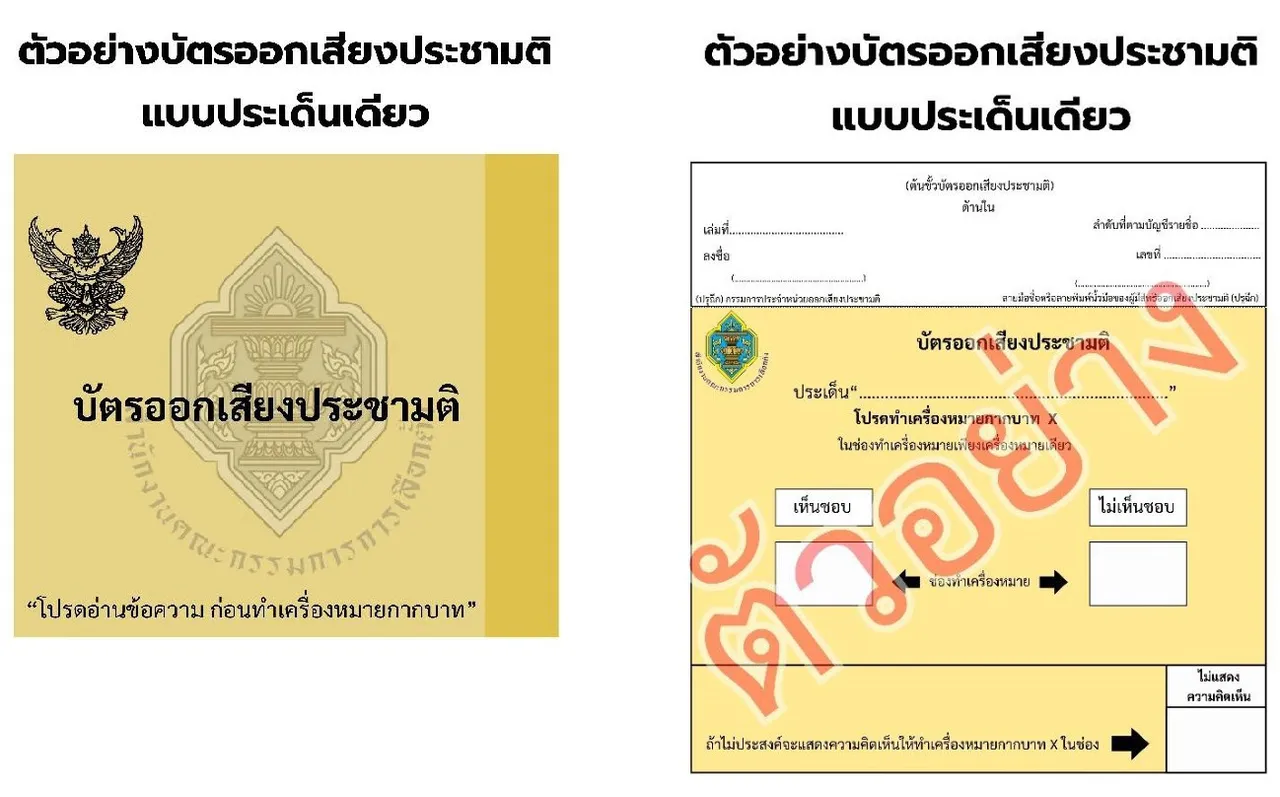 2026年选举共有三种颜色的选票,以便明确区分不同投票类别。绿色选票用于选举国会地方议员(每个选区一名代表),全国共400名议员,每位选民只能选择一位候选人。粉色选票用于选举国会政党比例代表议员,全国共100名议员,每位选民只能选择一政党,以决定各政党的议员席次。黄色选票用于宪法修正案公投,仅在2026年2月8日当天发放,选民需在选票上表明“同意”或“不同意”。