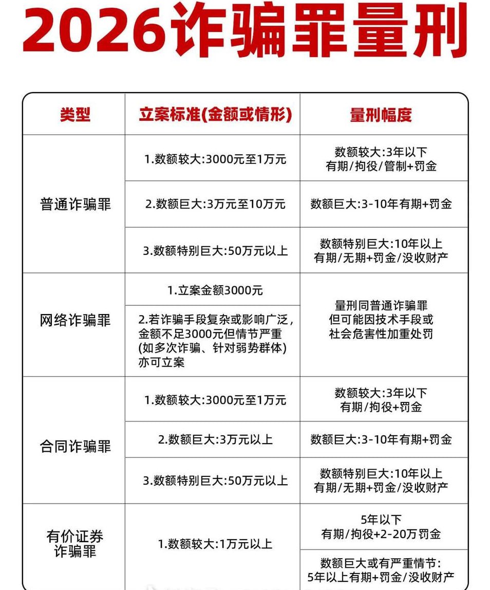 | 泰国华人网讯 2026年,诈骗罪量刑迎来新规,立案标准和量刑档次更加细化,尤其对电信网络诈骗明确了低门槛和处罚细则,为公众和涉案人员提供了清晰的法律参考。 根据最新司法解释,诈骗罪立案核心仍看“数额”,但各省可结合经济情况调整标准。普通诈骗起刑多数地区为6000元(如河南、四川为5000元),北京、上海等经济发达地区提高至1万元;电信网络诈骗门槛更低,3000元即可立案,3万元即被认定为“数额巨大”,处罚更严。 量刑档次方面: 1. 数额较大:普通诈骗6000元至10万元、电信诈骗3000元至3万元,处三年以下有期徒刑、拘役或管制,并处或单处罚金。每增加一定金额,刑期可相应递增。 2. 数额巨大:普通诈骗10万元至50万元、电信诈骗3万元至50万元,处三年以上十年以下有期徒刑,并处罚金。若涉组织作案或冒充国家机关等情节,刑期可进一步加重。 3. 数额特别巨大:50万元以上,处十年以上有期徒刑或无期徒刑,并处没收财产。情节特别恶劣可判无期。