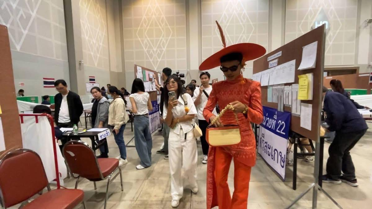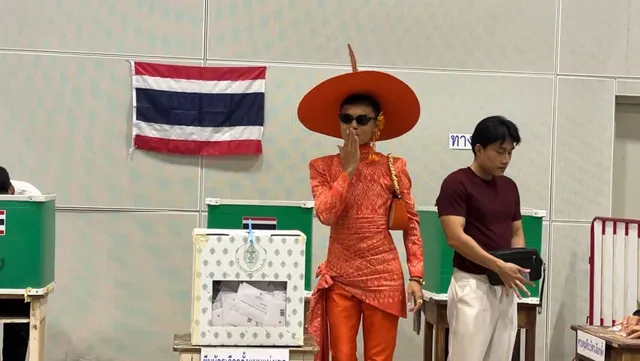 投票现场,一名身穿全套橙色泰式改良扎染丝绸服饰的39岁选民成为全场焦点。从帽子、上衣到裤子统一的亮眼色调吸引了现场民众和工作人员的目光,不少人主动上前合影,现场氛围热烈。