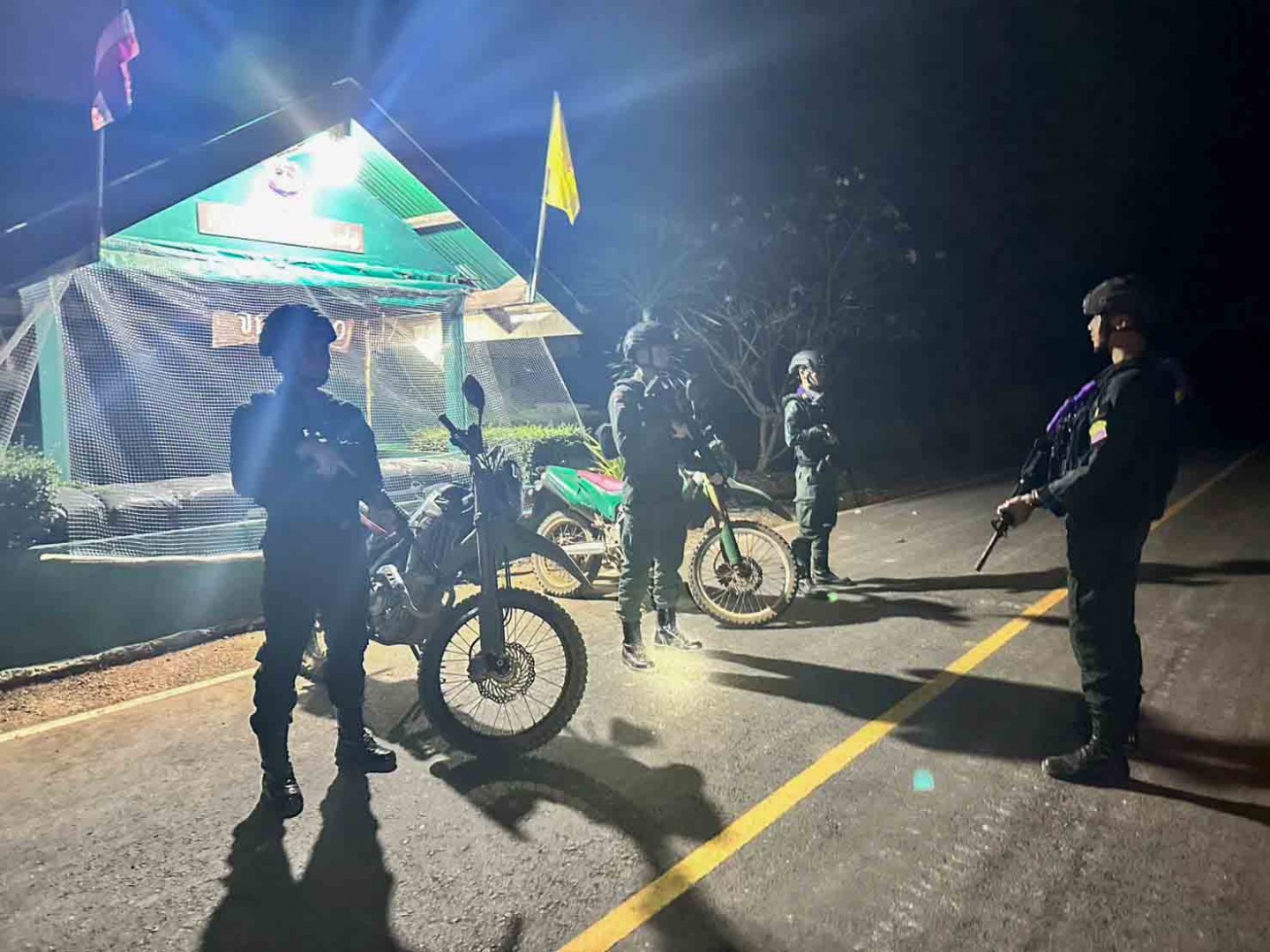 此外,第125中队及第3特遣队也组织摩托巡逻行动,由副队长埃卡猜·普拉昌负责,重点监控高科县泰方辖区,确保边境秩序。第12大队在高科县诺马孔村及第4特遣队也派出步行巡逻队,共6名人员,由副中队长派桑·布阿赛带队,防止非法越境、电话诈骗集团及灰色产业活动,并保障边境安全。