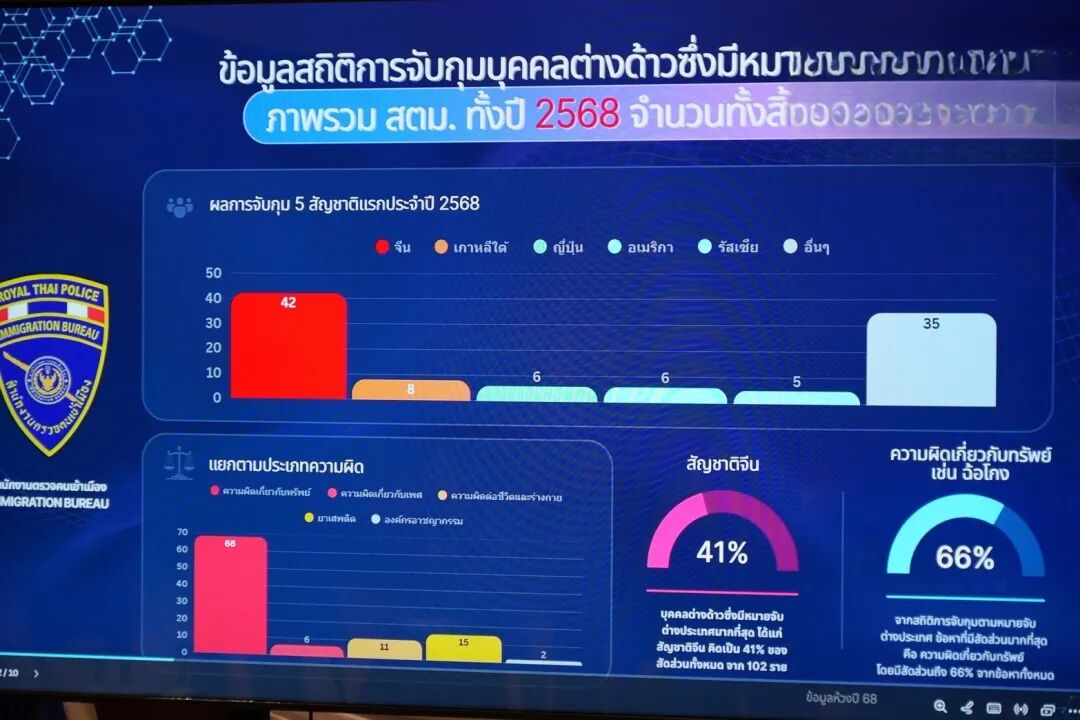 泰国华人网讯 根据泰国国家警察总署指示,移民局近期加强拦截与抓捕力度,针对在泰从事非法经营及危害社会治安的外籍人员展开专项行动,同时清查以泰国为犯罪基地的跨国犯罪团伙。 在移民局局长及高级警官指挥下,副局长潘塔纳警少将等召开新闻发布会通报抓捕情况。数据显示,2025年共抓获102名被外国通缉的外籍人员,中国籍42人,美国籍6人,涉及财产、性犯罪、毒品及有组织犯罪等多个类型。2026年至今已抓获23人,其中包括美国、俄罗斯、马尔代夫、越南及中国籍逃犯。