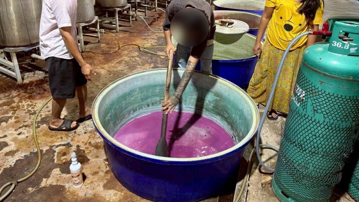 执法人员在4个目标地点展开搜查。第一处为帕差颂街道3间连排商铺,查获多品牌假止咳药及无食品药品监管编号的糖浆。第二处为非法饮料生产仓库,现场19岁缅甸籍女子正在煮制卡痛叶并混合不同口味糖浆,雇用外籍劳工在无卫生防护情况下灌装。现场查扣超过16种颜色糖浆、20升装液体及大量生产设备,且场地未取得合法许可。