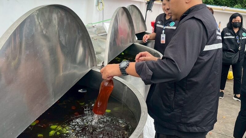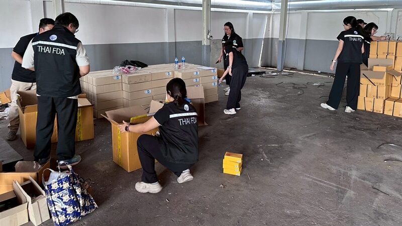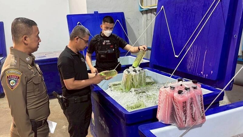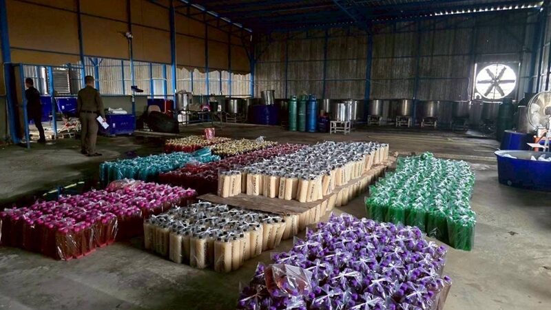 泰国华人网讯 2月11日,泰国消费者保护警察局联合食品药品监督管理局,在北榄府及周边地区展开突击行动,一举捣毁4处非法生产及储存窝点,查扣假止咳药、水果味混合卡痛饮料及大量生产设备和原材料,总价值超过2,575,000泰铢。