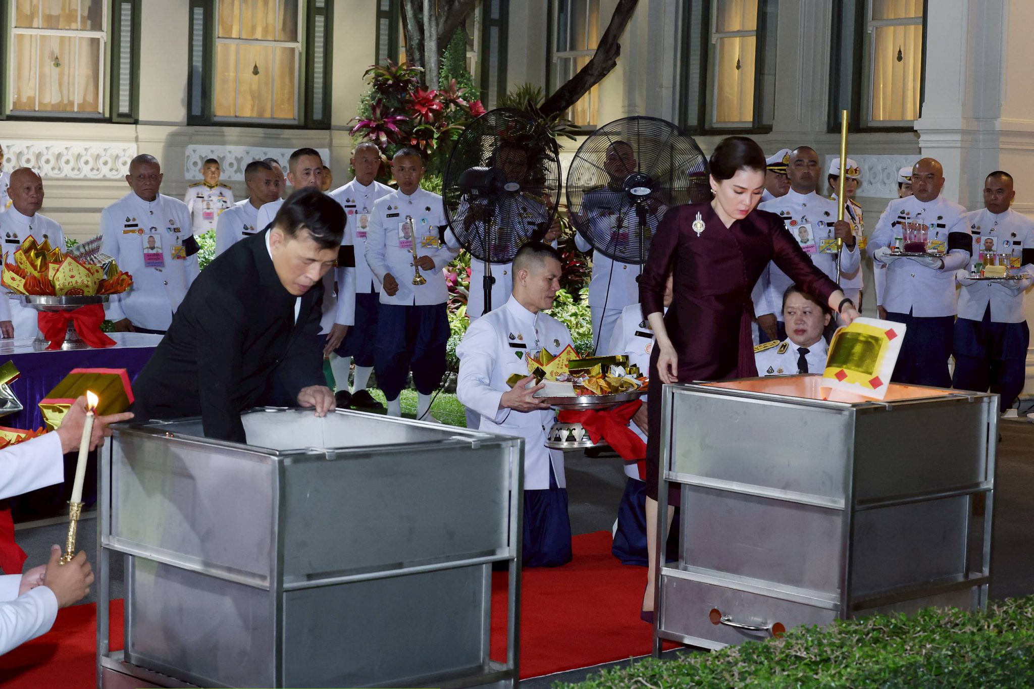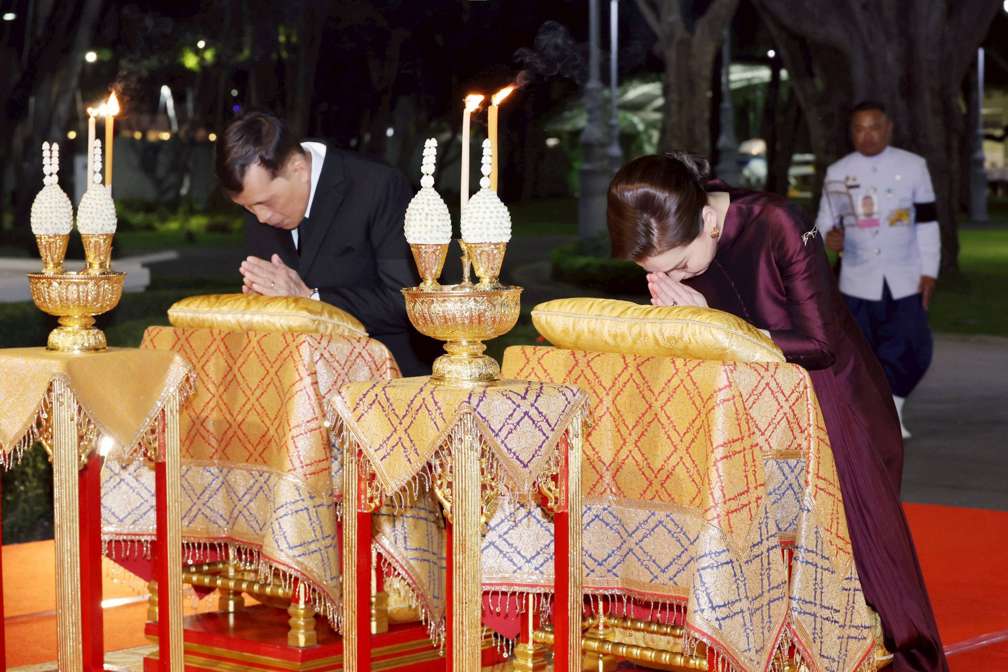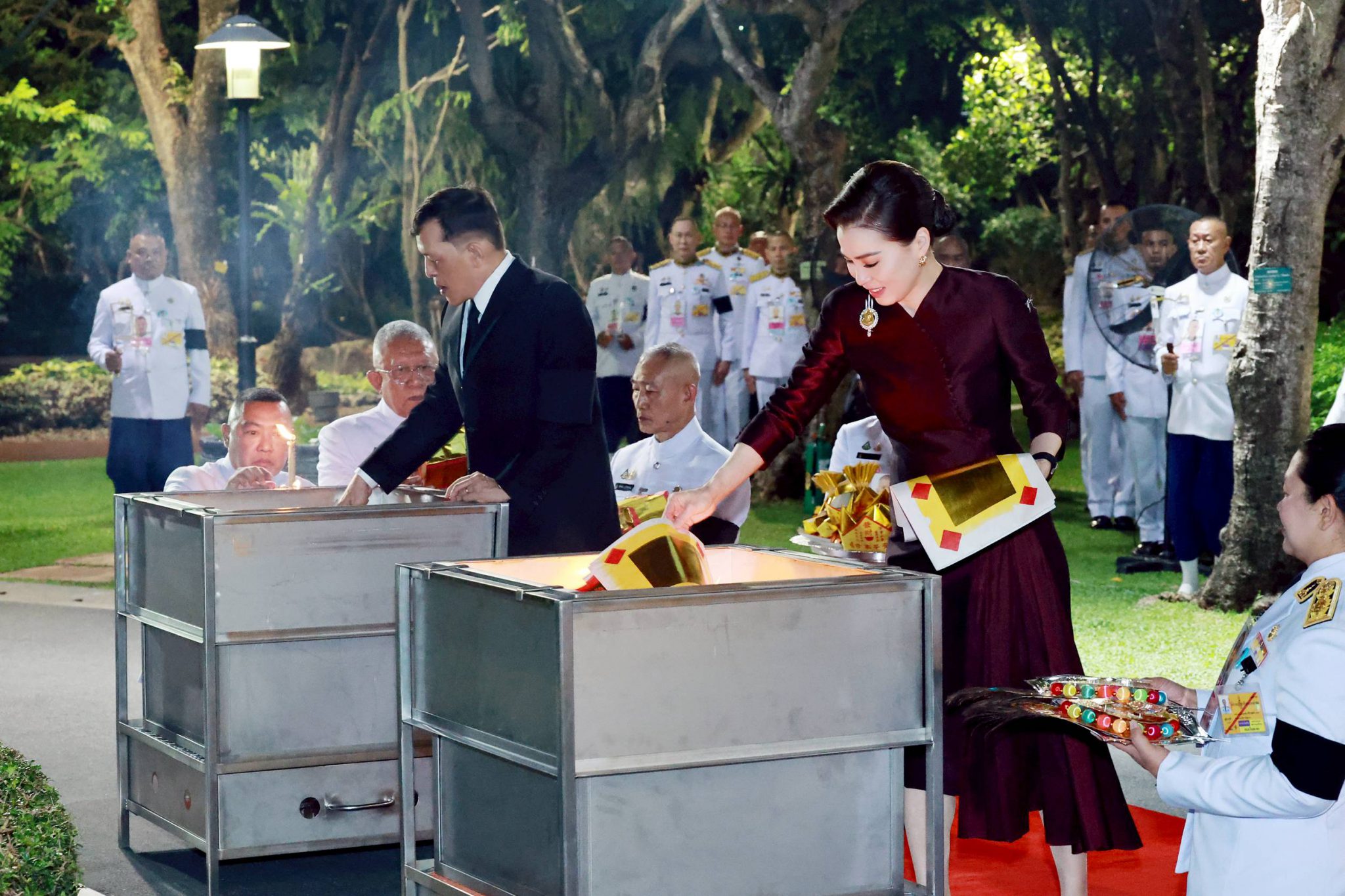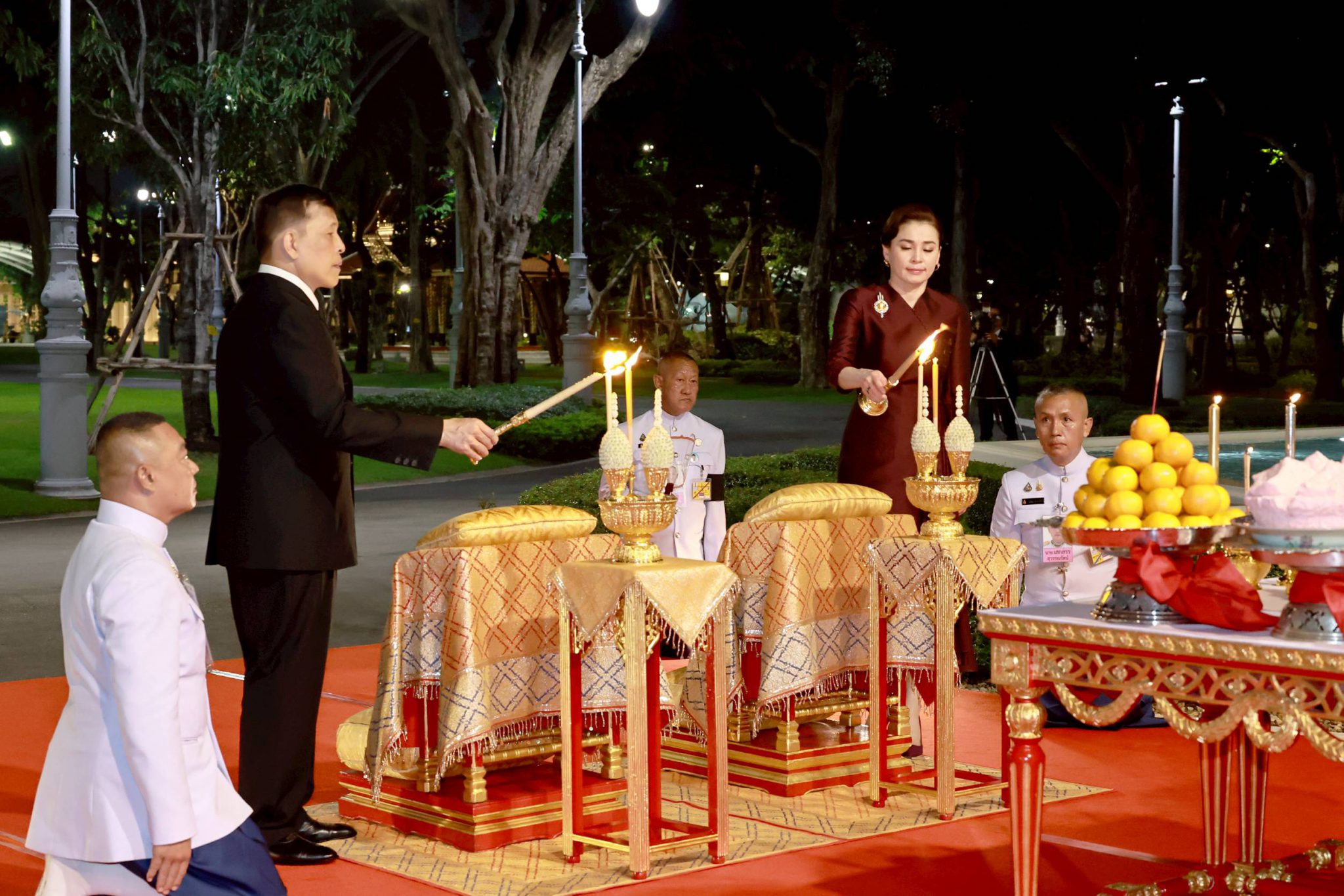 泰国华人网讯 2月17日18时50分,泰国十世王陛下与素提达王后殿下驾临律实宫安蓬沙坦殿前广场,御主持中国农历新年祭拜先王先妣牌位仪式。 仪式中,十世王陛下御点燃金银蜡烛与御香,并敬献于供案,素提达王后殿下亦御点燃香炷奉于供案。随后,两位陛下共同御点燃金制御炉内香炷,向先王先妣牌位行跪拜大礼,并依王室传统御焚金帛银帛。仪式结束后,国王与王后返回安蓬沙坦殿。