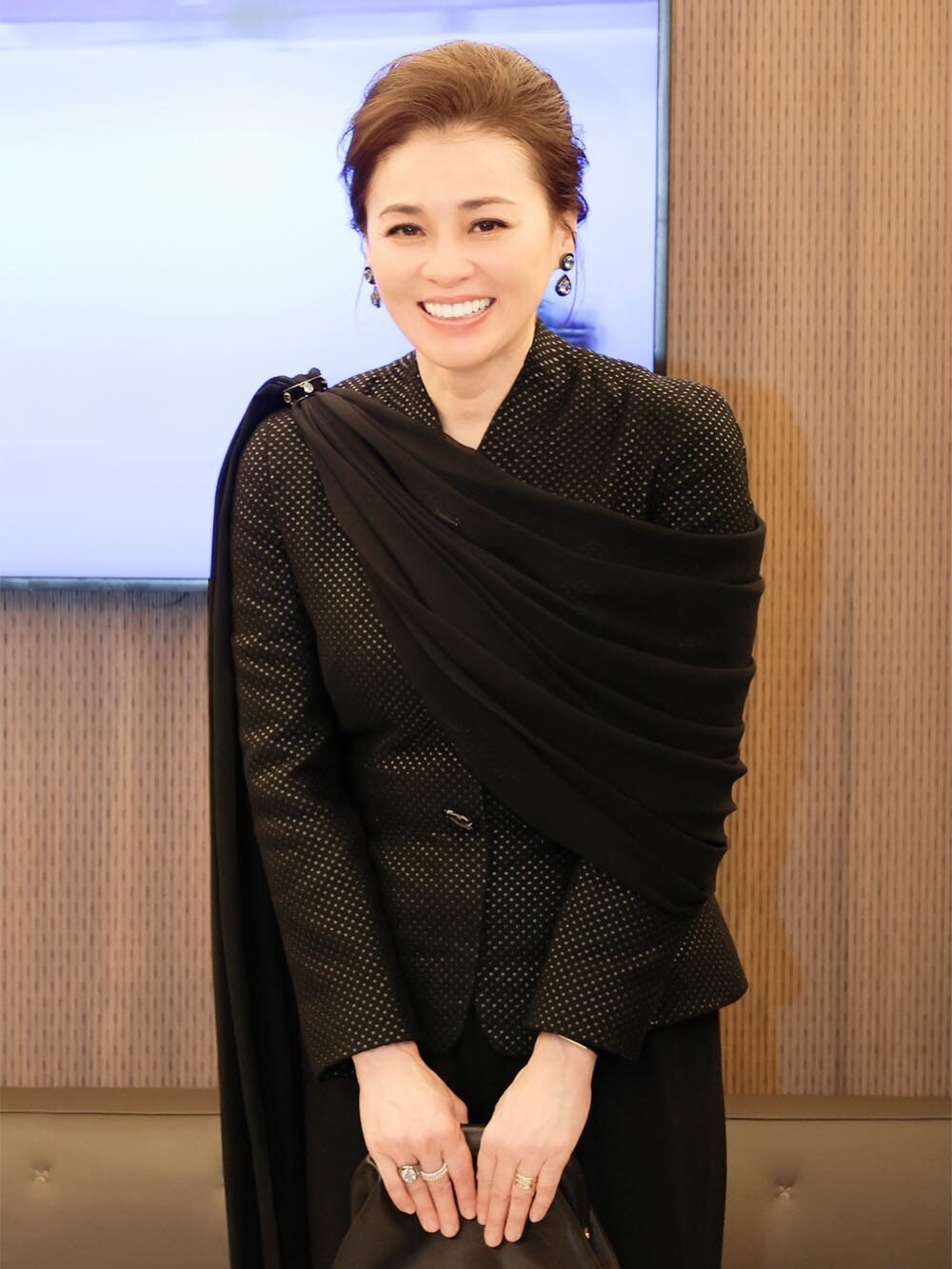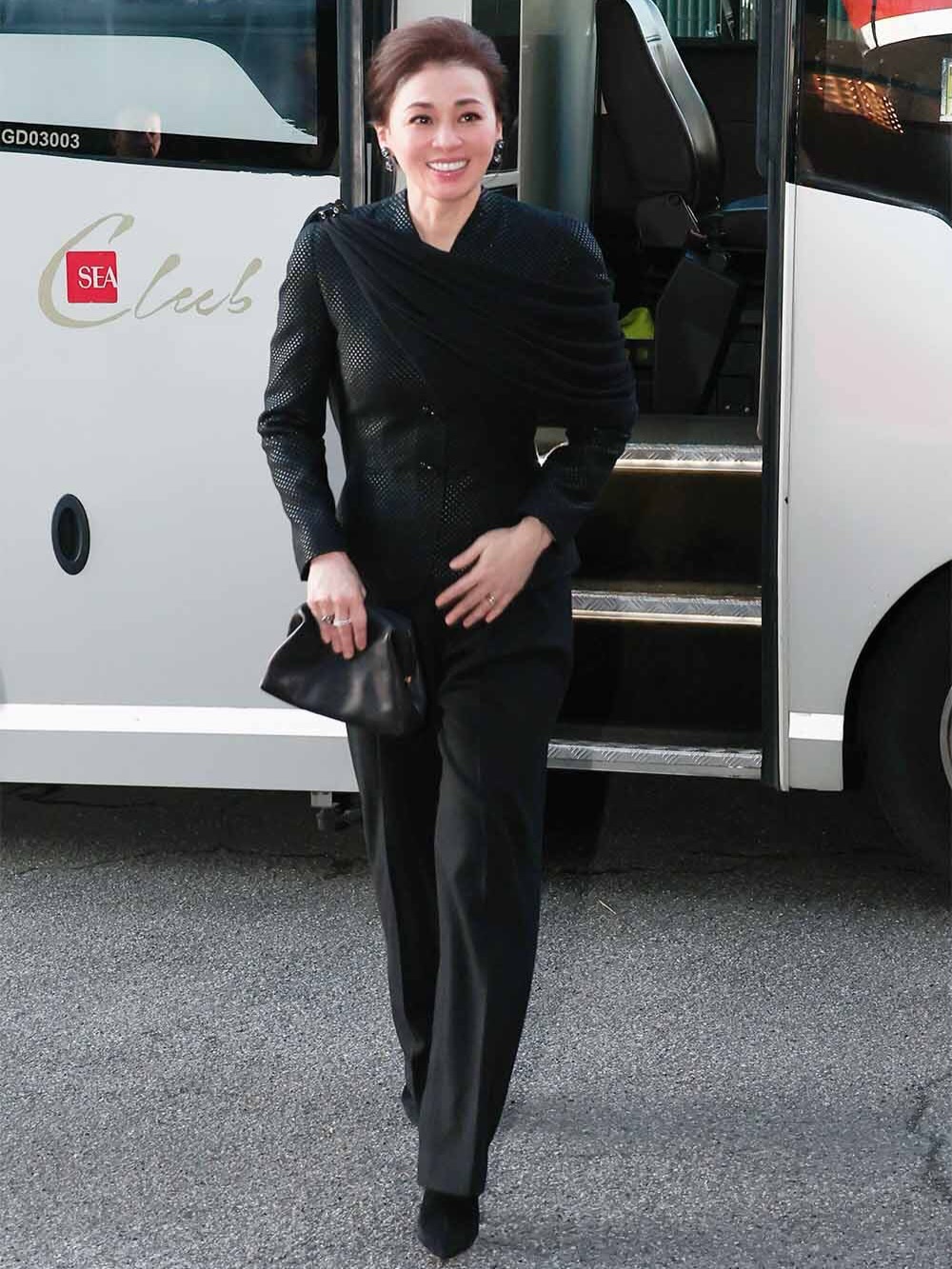 第1套造型:抵达米兰马尔彭萨机场 王后抵达米兰马尔彭萨机场时,身着黑色粗花呢双排扣西装外套,内搭黑色波点蕾丝上衣,外披黑色真丝雪纺披肩,下身配直筒长裤、黑色牛皮手拿包及长靴,整体利落大气。