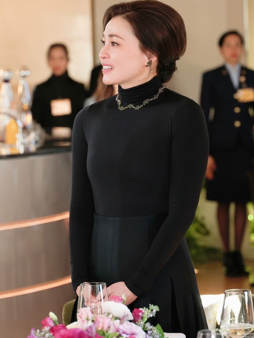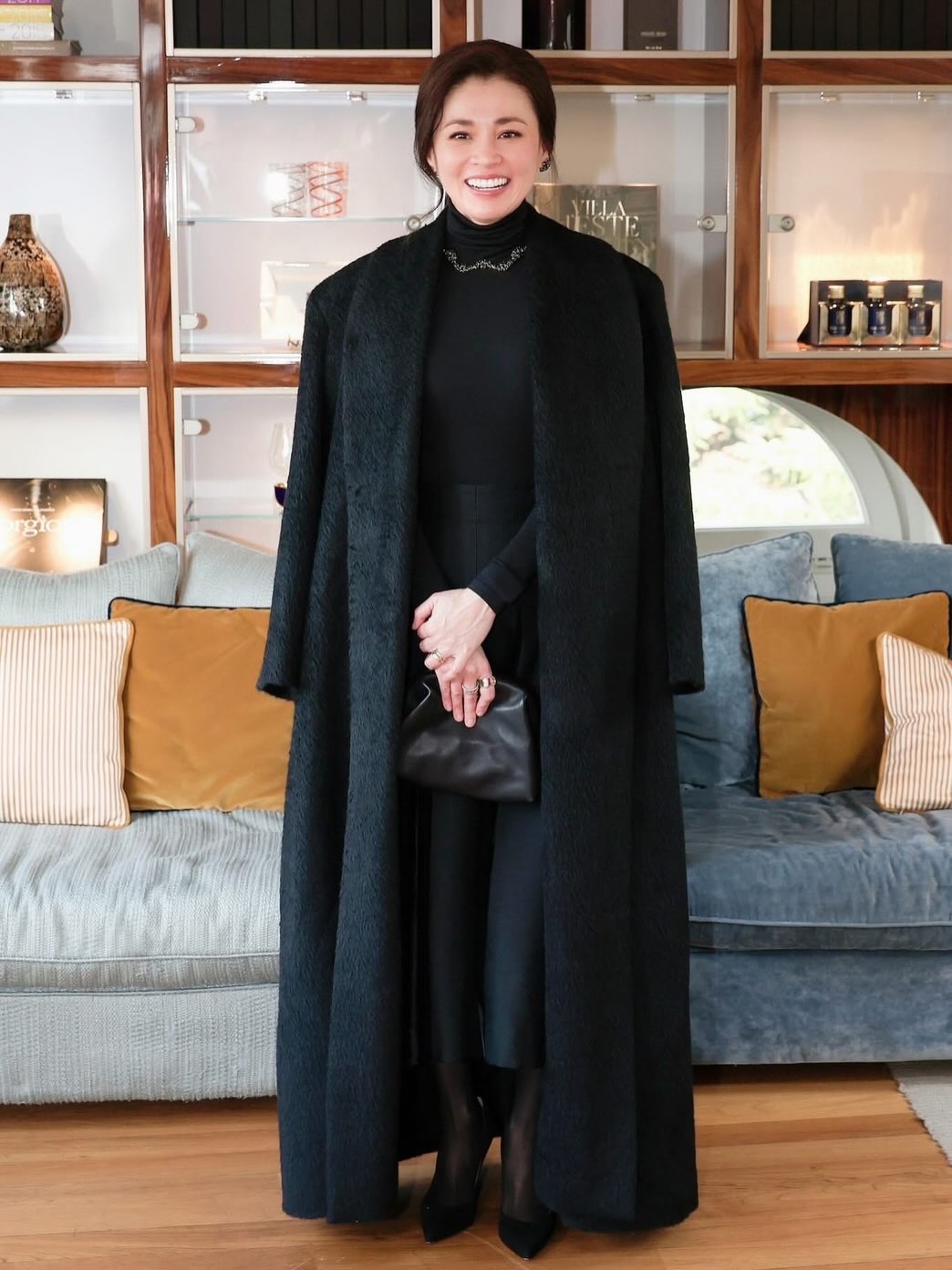 第2套造型:出席午宴 午宴场合,王后换上黑色高领长袖上衣,搭配高腰中长款伞形半裙。裙身采用玻璃纱质感丝绸拼接天鹅绒,层次丰富;外搭短绒长大衣,内衬龟甲纹丝绸,细节尽显华贵。
