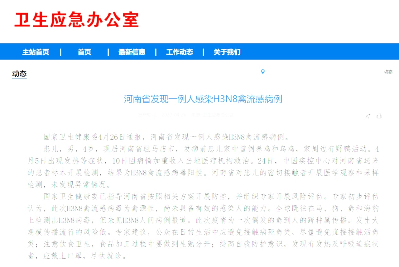 中国国家卫生健康委4月26日通报,河南省发现一例人感染H3N8禽流感病例。 患儿,男,4岁,现居河南省驻马店市,发病前患儿家中曾饲养鸡和乌鸦,家周边有野鸭活动。4月5日出现发热等症状,10日因病情加重收入当地医疗机构救治。24日,中国疾控中心对河南省送来的患者标本开展检测,结果为H3N8禽流感病毒阳性。河南省对患儿的密切接触者开展医学观察和采样检测,未发现异常情况。 国家卫生健康委已指导河南省按照相关方案开展防控,并组织专家开展风险评估。专家初步评估认为,此次H3N8禽流感病毒为禽源性,尚未具备有效的感染人的能力。全球既往在马、狗、禽和海豹上检测出H3N8病毒,但未见H3N8人间病例报道。此次疫情为一次偶发的禽到人的跨种属传播,发生大规模传播流行的风险低。专家建议,公众在日常生活中应避免接触病死禽类,尽量避免直接接触活禽类;注意饮食卫生,食品加工过程中要做到生熟分开;提高自我防护意识,发现有发热及呼吸道症状者,应戴上口罩,尽快就诊。 |