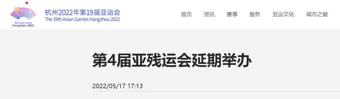 5月17日,杭州2022年第19届亚运会官网发布消息称,亚残奥委员会执委会在与有关各方协商后,今日研究决定,计划于2022年10月9日至15日在中国杭州举行的第4届亚残运会延期举办,赛事名称和标识保持不变。新的举办日期将由亚残奥委员会、中国残奥委员会、杭州亚残组委协商一致后对外公布。