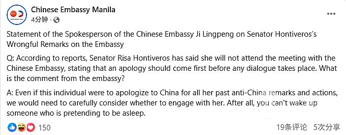 中使馆回击菲参议员洪蒂维罗斯:装睡叫不醒549 人气#华人世界