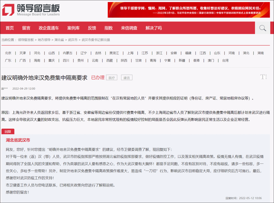 网民4月29日在人民网向武汉市委书记留言,建议明确外地来汉免费隔离要求,将提供免费集中隔离的范围限制在“在汉有常居地的人员”并要求其提供相应的证明,如身份证、房产证、常居地租房协议等。上海周边部分省份仅提供付费集中隔离,不少上海周边省市人员了解到武汉市提供免费集中隔离后,计划来武汉进行隔离。这样会导致武汉大量的财政支出、抗疫压力巨大,本地居民担忧现有的疫情较好控制的局面是否会因此反弹,从而影响居民正常生活以及企业正常经营。