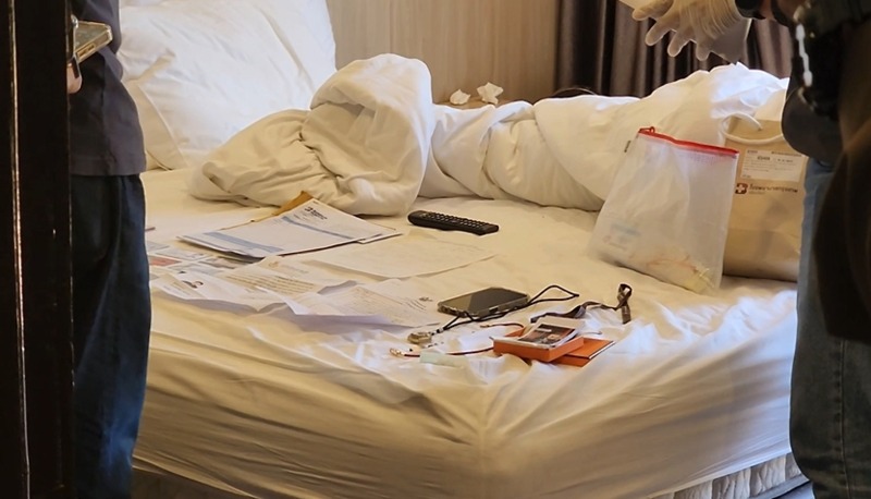 警方进入308号客房后发现,死者仅穿一条裤子躺在床边,房间内没有打斗或财物翻动痕迹。床头柜上放有一把水果刀、一瓶约剩一半的酒以及几份来自清迈私立医院的药品和病历记录。初步检查显示,死者除左手腕伤口外无其他外伤。