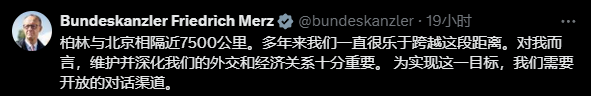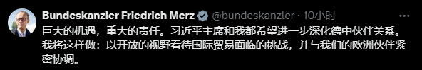 据报道,默茨当天上午在故宫博物院院长王旭东的陪同下游览北京故宫,详细了解中国历史文化。参观过程中,他在留言簿上写下祝福语,并以中文对外发布相关内容,展现出积极沟通的姿态。对于中德关系而言,这种主动用中文表达愿景的方式,被视为释放友好与重视的信号。 当天下午,默茨还参观了德国汽车企业梅赛德斯-奔驰中国工厂,随后率团前往浙江杭州,考察中国机器人企业宇树科技等高新技术公司。行程安排显示,其访问重点不仅限于文化交流,更聚焦于高端制造与科技创新领域,凸显经贸合作的重要性。 事实上,在2月25日访华首日,默茨已在社交媒体以中文连发三条帖文。他在首条帖文中写道:“柏林与北京相隔近7500公里。多年来我们一直很乐于跨越这段距离。对我而言,维护并深化我们的外交和经济关系十分重要。为实现这一目标,我们需要开放的对话渠道。”随后两条帖文继续表达对深化德中双边合作的期待。