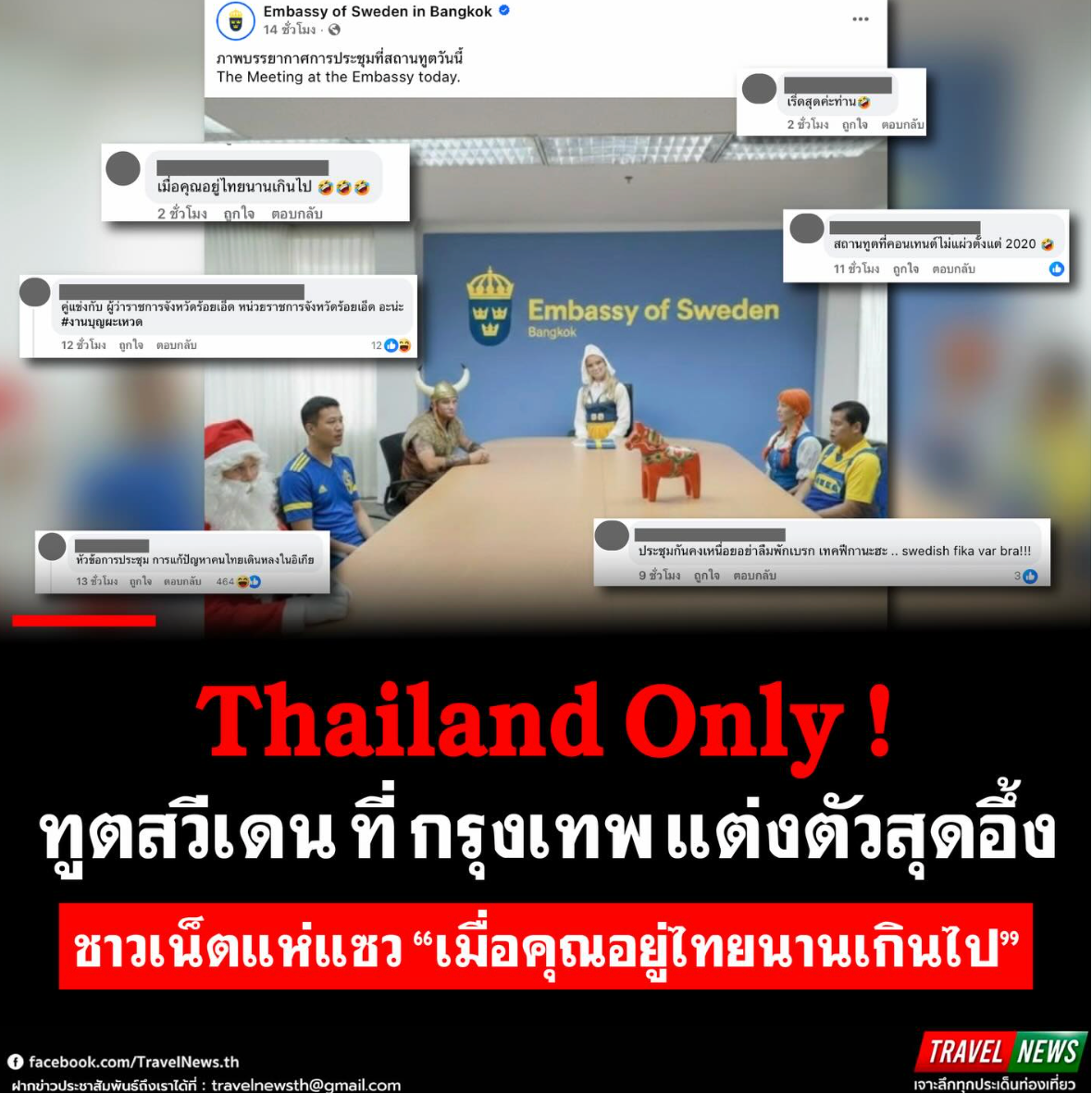 | 泰国华人网讯 近日,瑞典驻泰国大使馆在其官方脸书页面发布的一张“会议照片”意外走红网络。帖文仅简单写道“今日在使馆举行会议”,但画面内容却打破了大众对外交场合一贯严肃刻板的印象,迅速引发泰国网友热议。 照片显示,会议现场所有与会人员均身着具有瑞典象征意义的装扮登场,包括圣诞老人、瑞典国家足球队球员、古代维京战士、身穿瑞典传统服饰的女性角色,以及童话人物“长袜子皮皮”,还有身穿宜家经典工装的员工形象。整体氛围轻松活泼,却又巧妙融合了瑞典文化符号,形成强烈视觉反差。