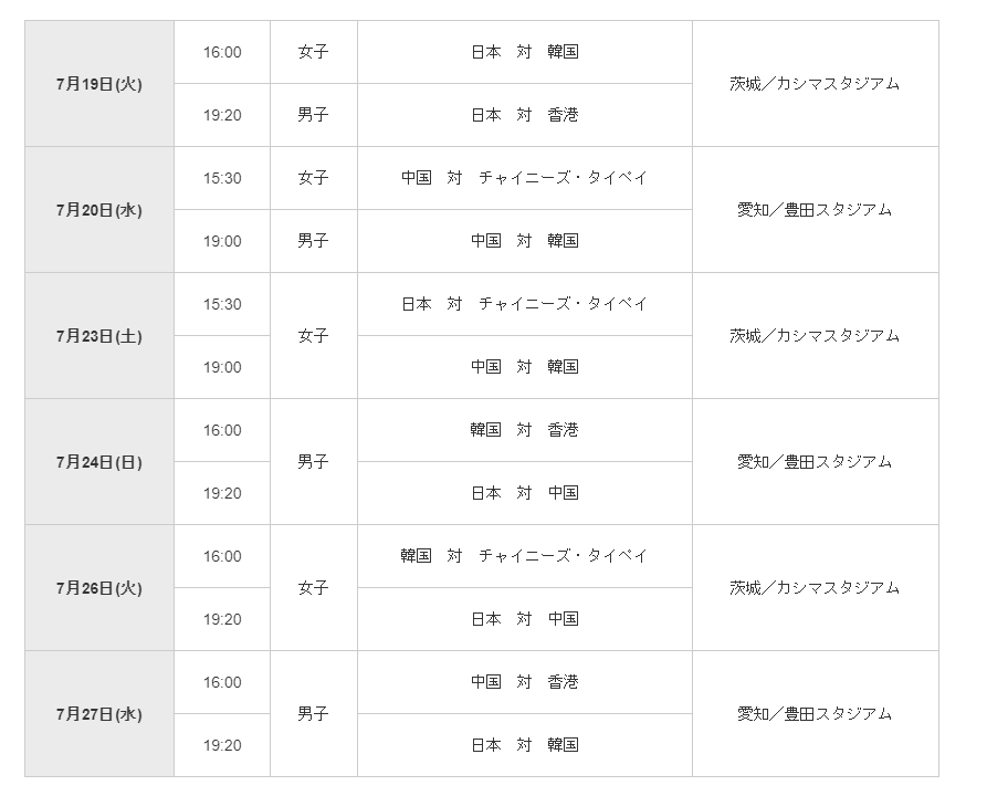 北京时间5月17日消息,今天日本足协正式公布东亚杯赛程,中国男足首战将于7月20日对阵韩国队,中国女足则将于同一天迎战中国台北队。本次赛事将于7月19日-7月27日在日本举行,中国足协将派出U23男足和中国女足出战。 男足 7月20日 18:00 中国VS韩国 7月24日 18:20 日本VS中国 7月27日 15:00 中国VS中国香港 女足 7月20日14:30 中国女足VS中国台北女足 7月23日14:30 中国女足VS韩国女足 7月26日18:20 中国女足VS日本女足