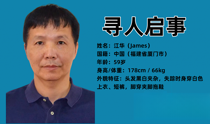 江华来自中国福建厦门市,身高178厘米,体重66公斤,失踪时身穿白色上衣、短裤,脚穿夹脚拖鞋,头发黑白夹杂,信仰基督教。据家属回忆,江华于2025年3月18日抵达菲律宾马尼拉机场,三天后在圣佩德罗市失联。4月底及5月4日,他曾在Muntinlupa市被目击于Sitio Masagana街及South Park Center by Ayala Malls附近,随后再无消息。 家属推测江华可能前往教堂或宗教相关场所寻求帮助,因此呼吁各地教会、社区团体及居民特别留意。菲律宾警方及中国驻菲大使馆已接案调查,但迄今未取得突破。家属希望通过媒体与社区力量,扩大信息传播范围,并向提供有效线索或直接协助找到江华的人士承诺重金酬谢。