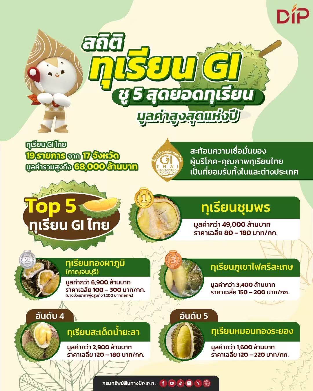 泰国华人网讯 2026年3月2日,泰国商业部知识产权厅公布数据显示,泰国地理标志(GI)榴莲去年市场总价值突破680亿泰铢,再创历史新高。这一成绩不仅展现了泰国优质水果品牌的实力,也体现了消费者对GI产品品质与标准的高度信心。 知识产权厅厅长阿拉蒙表示,目前全国已有来自17个府的19种榴莲获得GI注册。2025年市场价值最高的五大GI榴莲均具鲜明地域特色,且多为深受消费者喜爱的金枕品种。排名第一的是春蓬府春蓬榴莲,市场价值超过490亿泰铢,年产量37.9万吨,平均售价每公斤80至180泰铢。该品种果形圆润、果壳薄、果肉细腻柔软、香甜油润且气味不刺鼻,产区土壤肥沃、排水良好,盛产期为5月至次年2月。